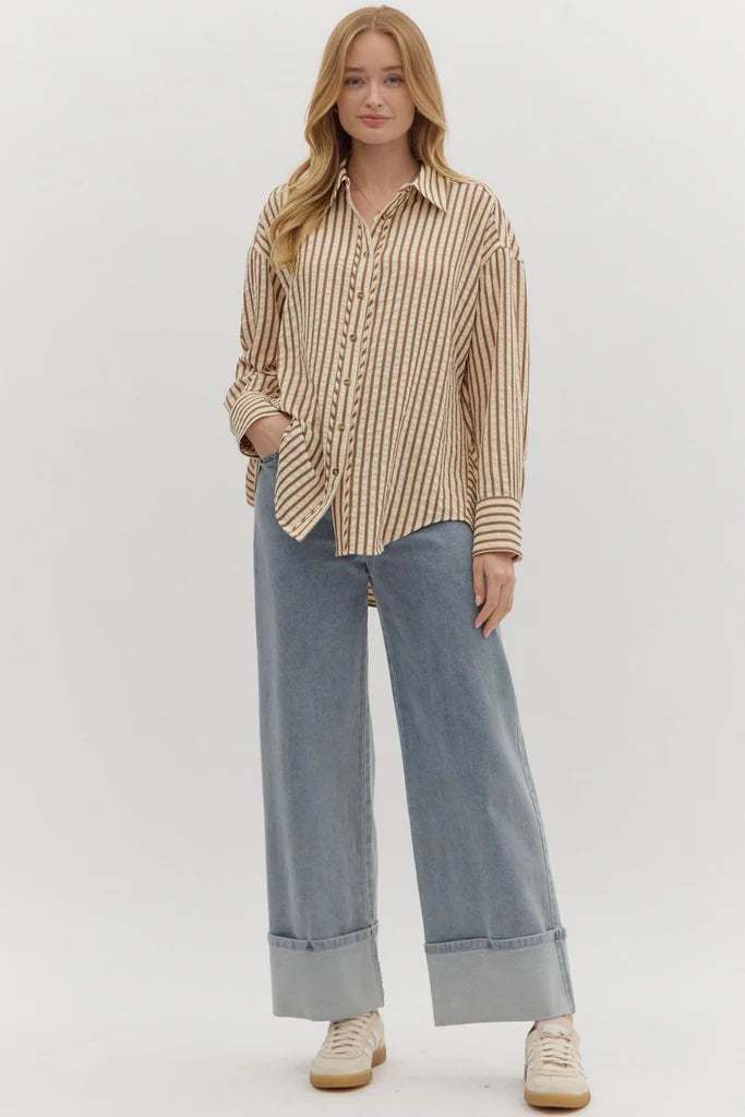 The Lovely Striped Top Brown features a textured striped pattern with a classic button-down collar and long sleeves.