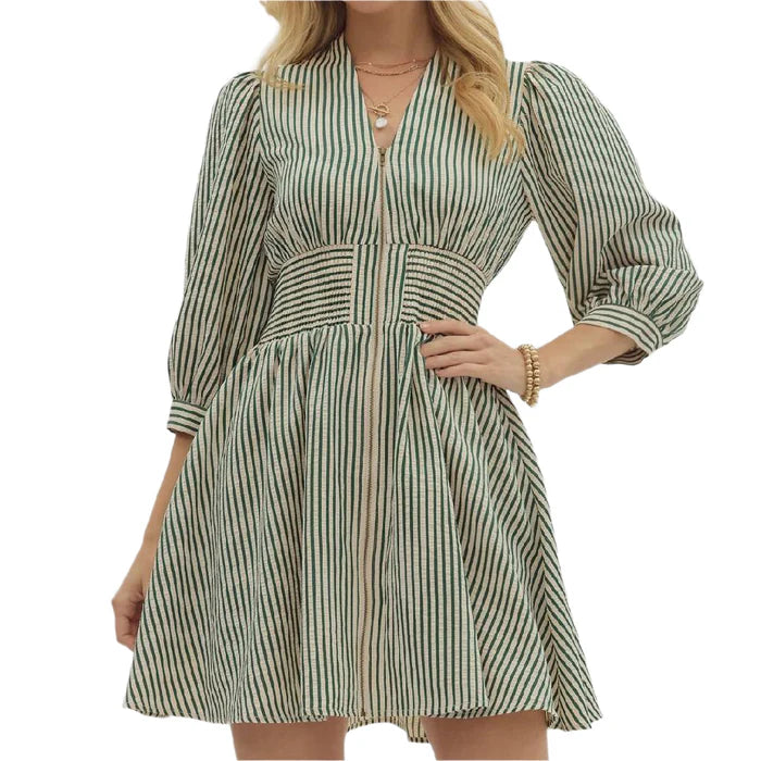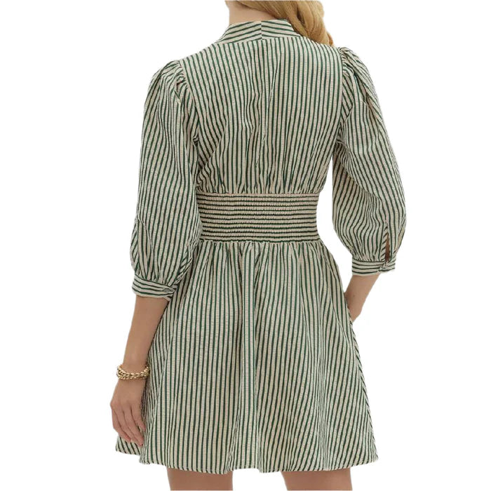 This midi dress features a hunter green stripe print with 3/4-length band puff sleeves and a smocked waistband, combining style and comfort effortlessly.