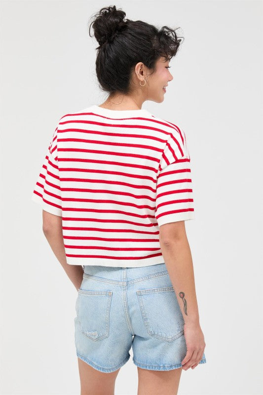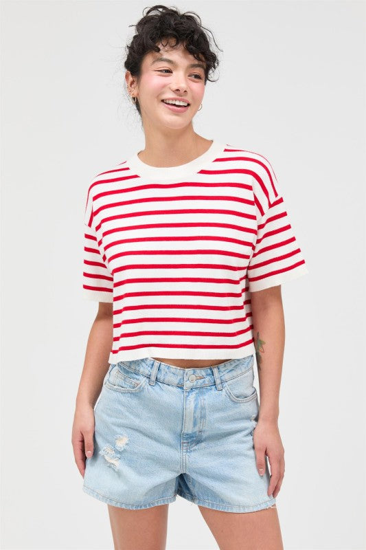 We can't get over how cute this flattering top is. It has a classic design that'll never go out of fashion, framed with a round neck, drop shoulders and short sleeves. Striped lends it added visual interest. Style with high waisted jeans.