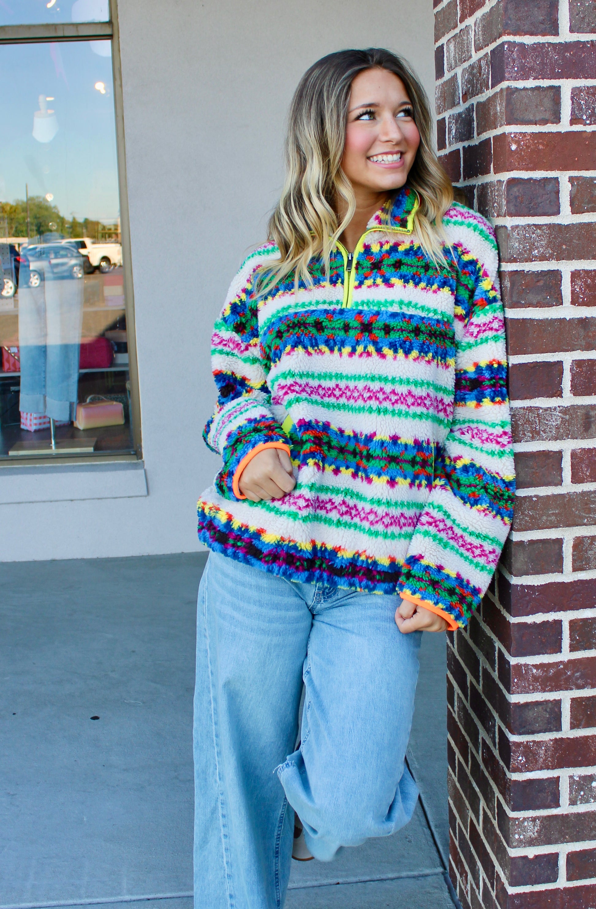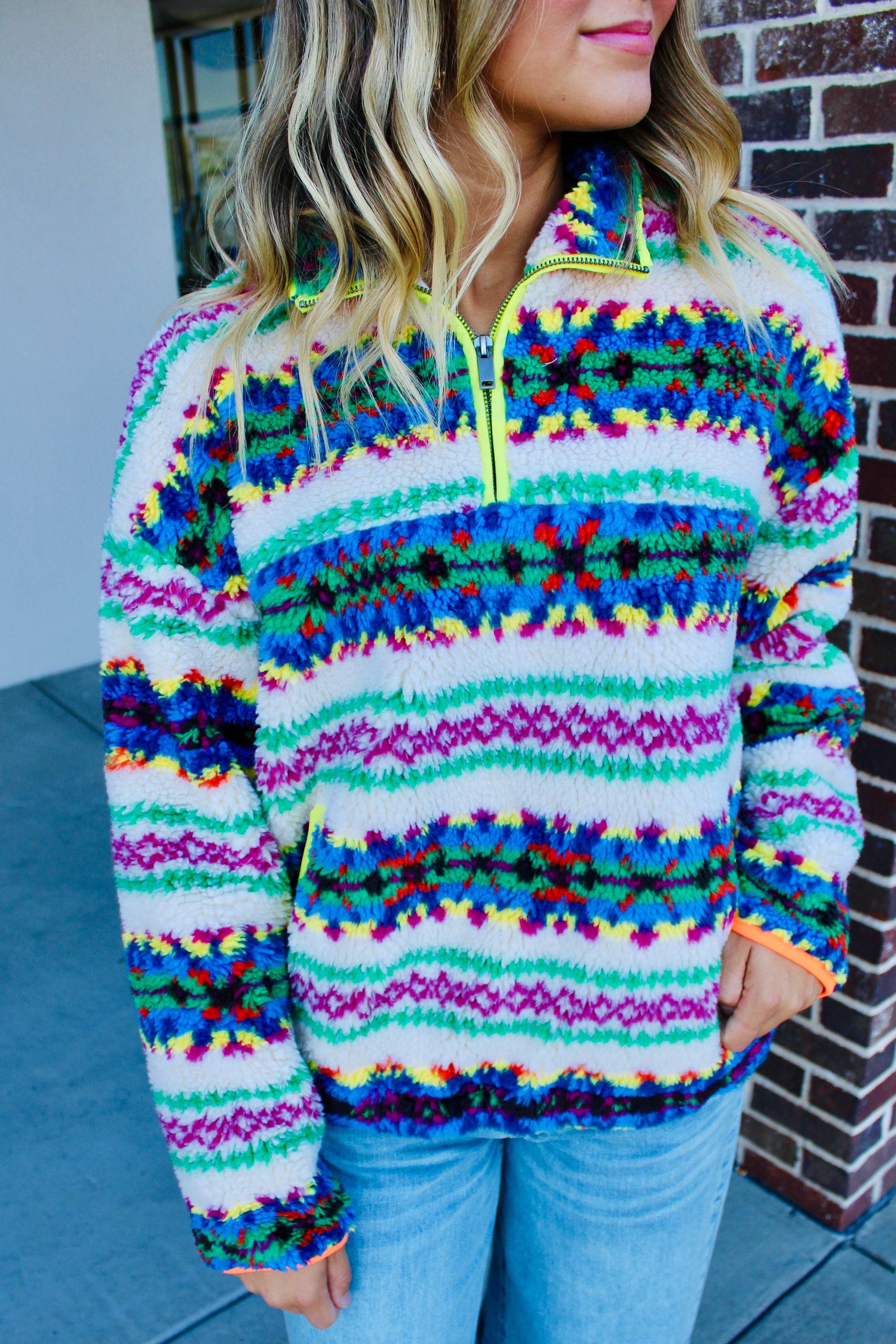 Cozy sherpa fleece pullover in soft abstract print, creating a charming vintage-inspired look with modern comfort. The plush teddy texture offers exceptional warmth while the quarter-zip closure with contrast trim adds sporty functionality, and the relaxed, oversized fit makes it perfect for layering. This statement piece combines cottage-core aesthetics with practical cold-weather design, transforming a basic fleece into an eye-catching wardrobe essential that pairs beautifully with everything from jeans to leggings.