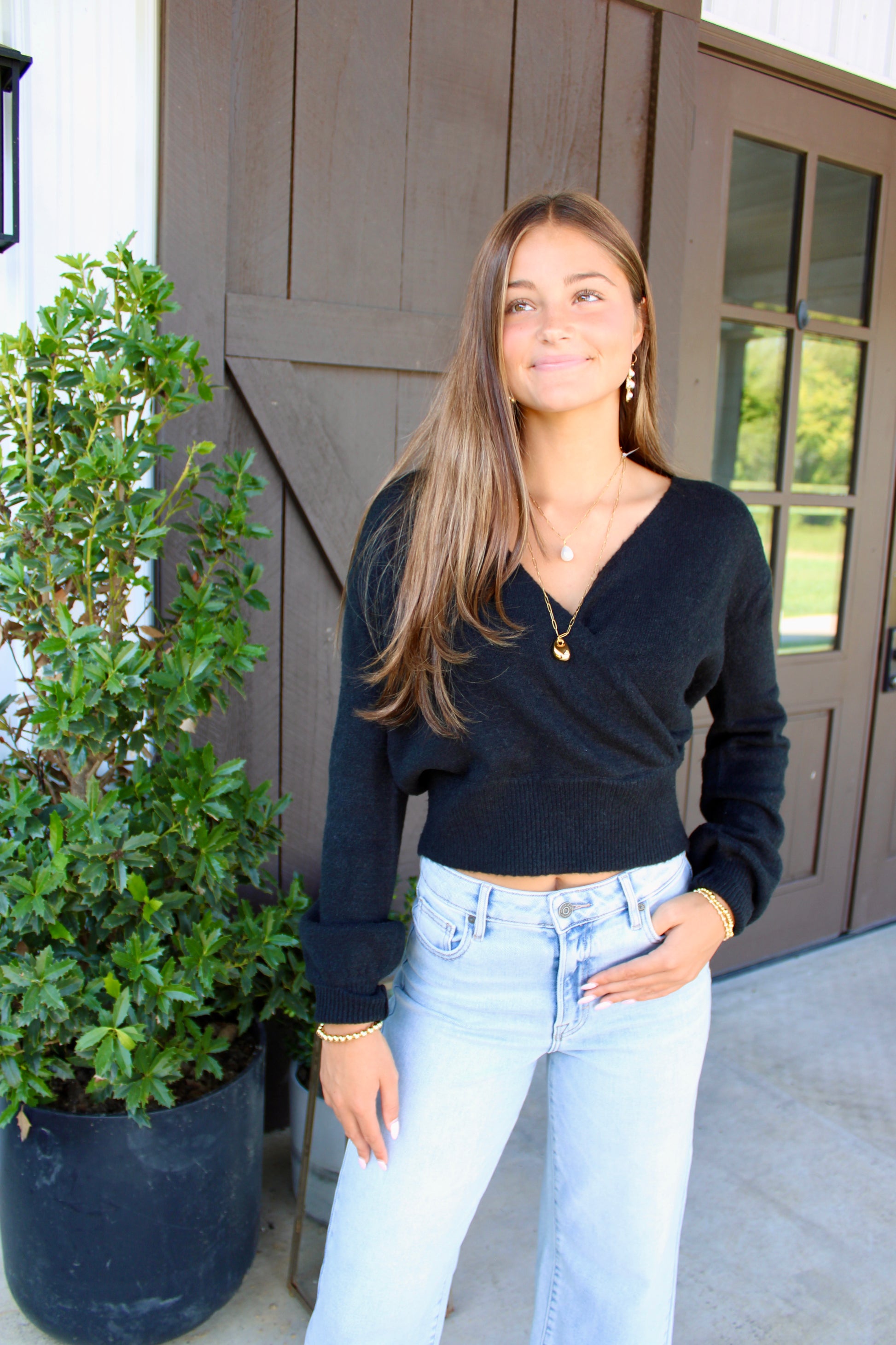This surplice knit sweater features a flattering V-neckline with an elegant overlapping front. Designed with a relaxed drop shoulder and finished with ribbed cuffs and hem, the fitted waistband adds subtle structure. Perfect for pairing with jeans or skirts, it's ideal for cozy evenings and casual outings alike.