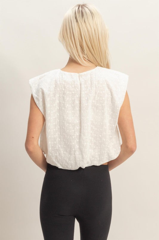 Elevate your layers with this intricate cotton eyelet top and shorts set