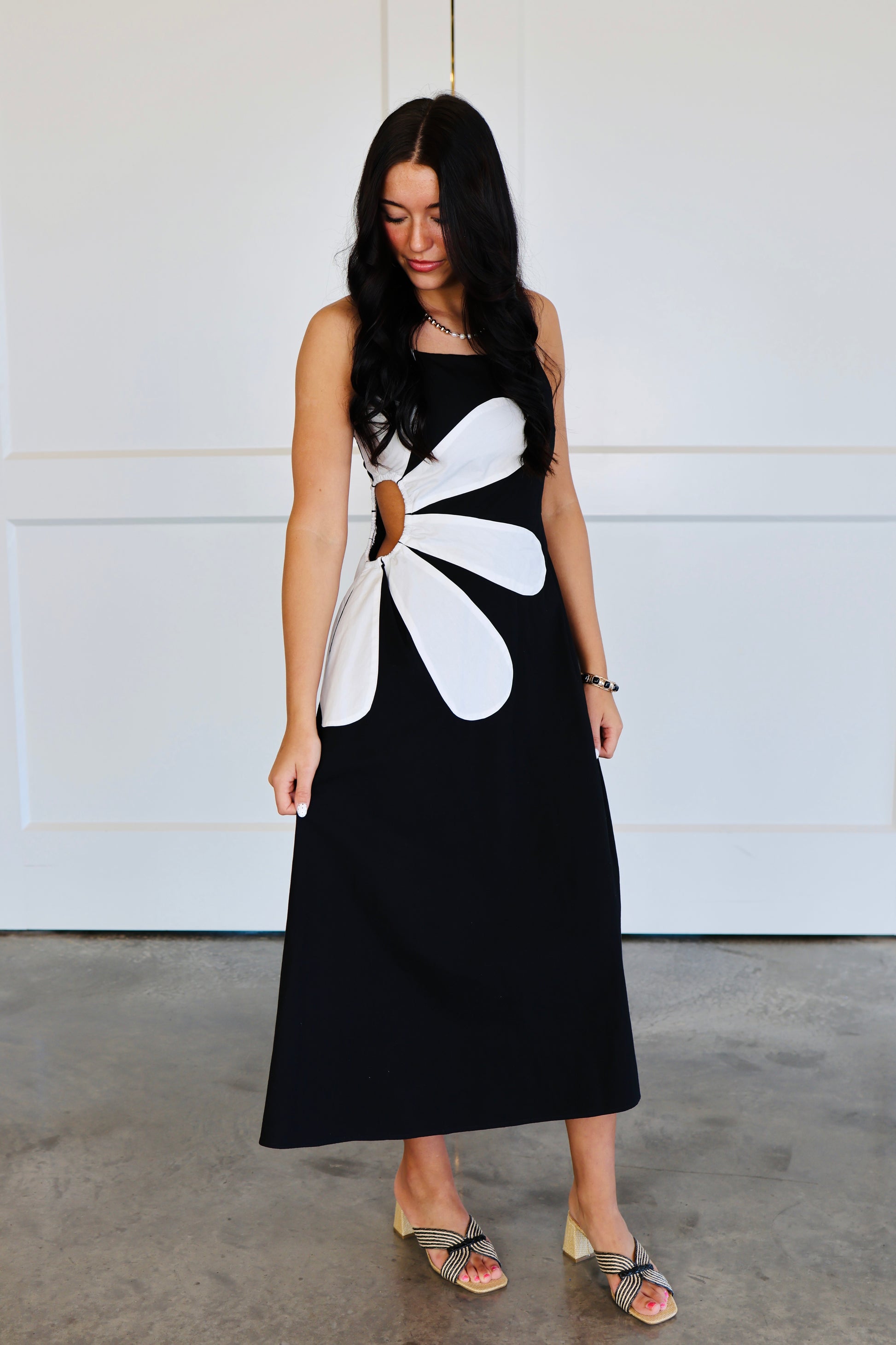 Sleeveless side cutout flower detail long dress in cotton poplin fabric. This sundress style features a side cut out detail with adjustable tie, square neckline, adjustable straps, side pockets, a feminine patchwork flower detail.