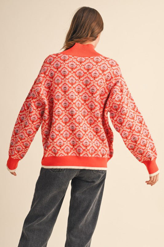 Floral Mock Neck Half Zip Pullover Sweater