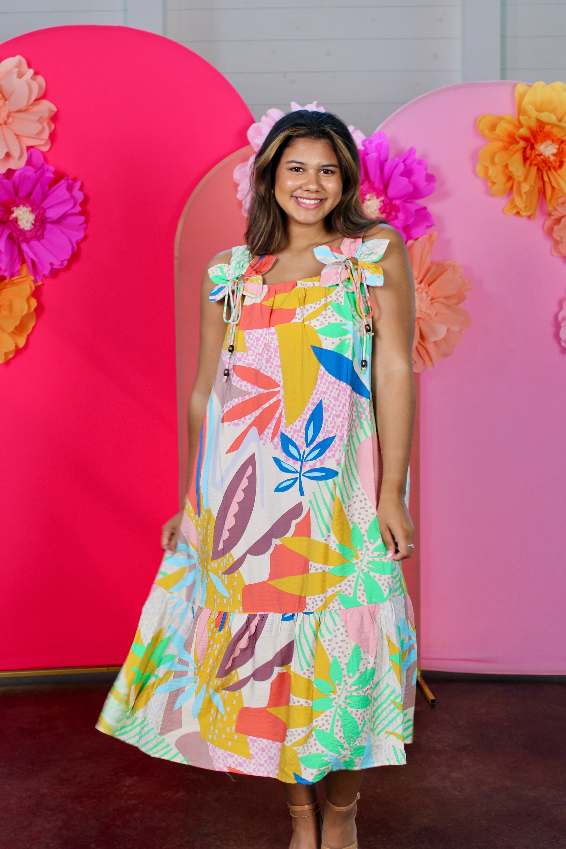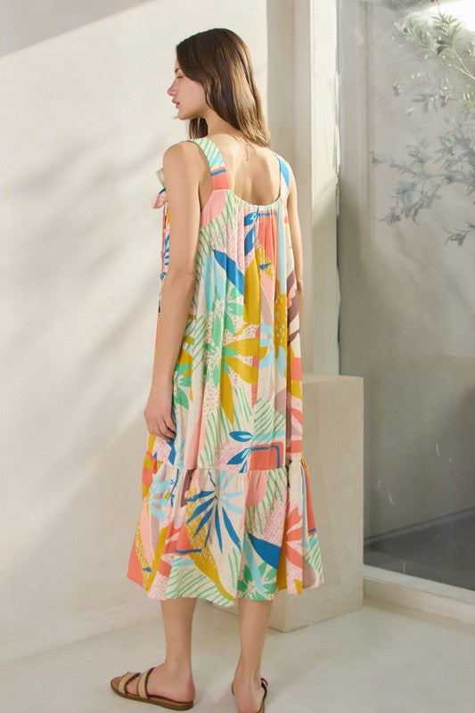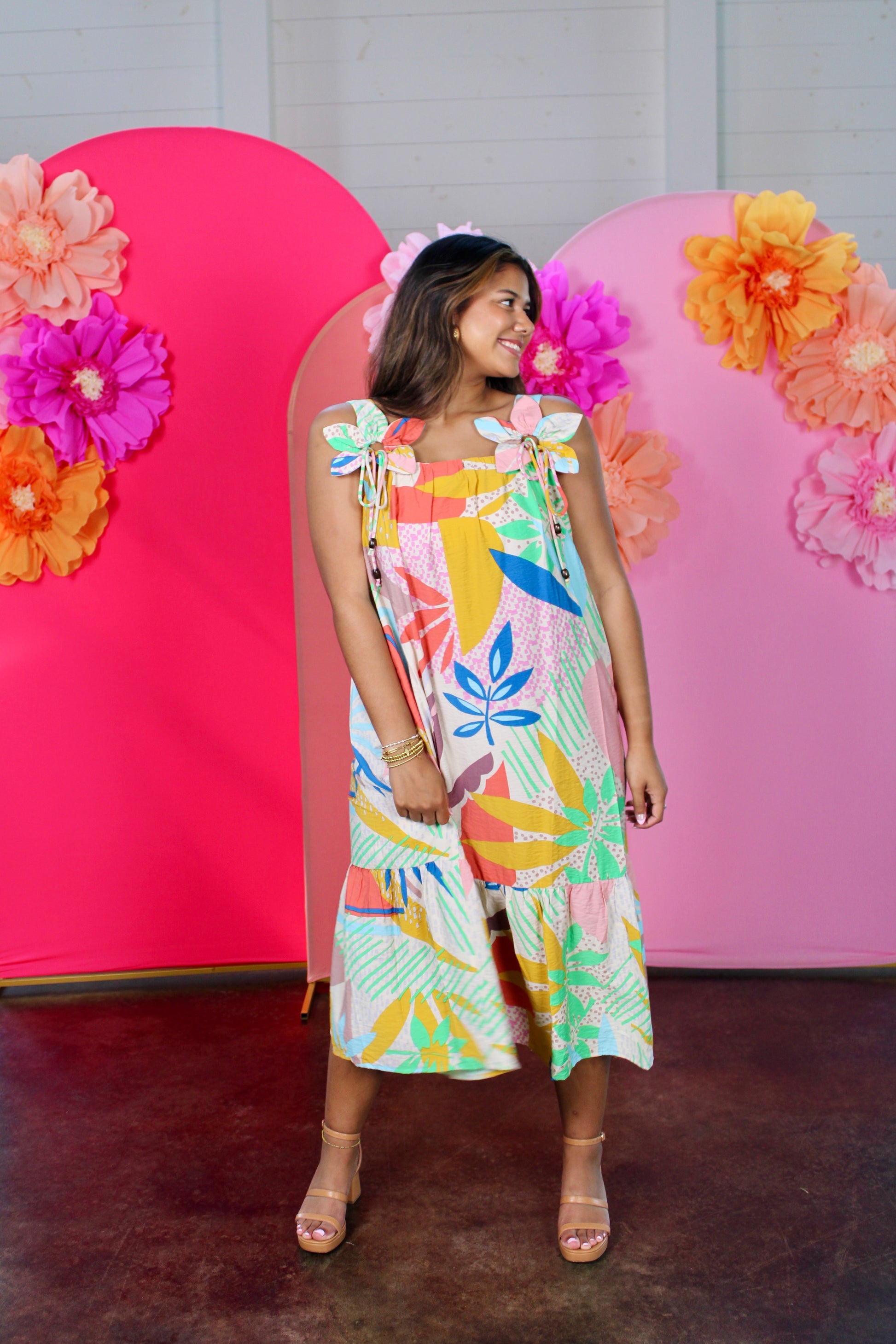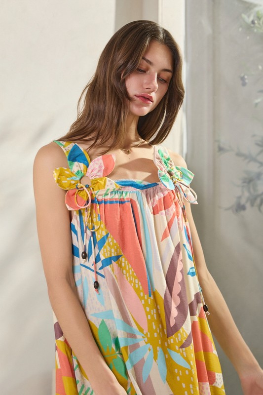 Tropical printed sleeveless dress with 3d flower detail strap.