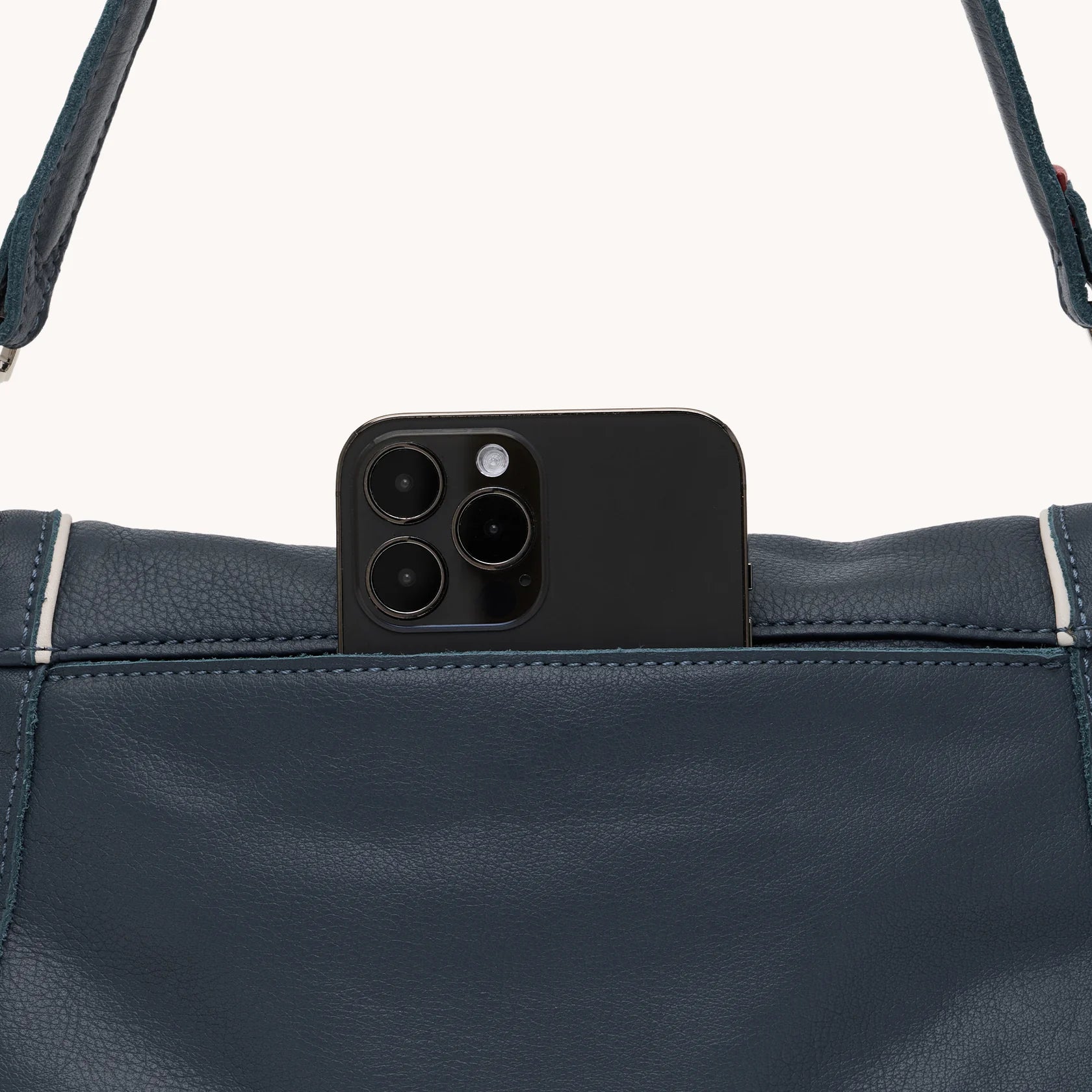 - Crafted with a grey-leaning navy pebble leather with sapphire undertones and Calla Lily White piping details