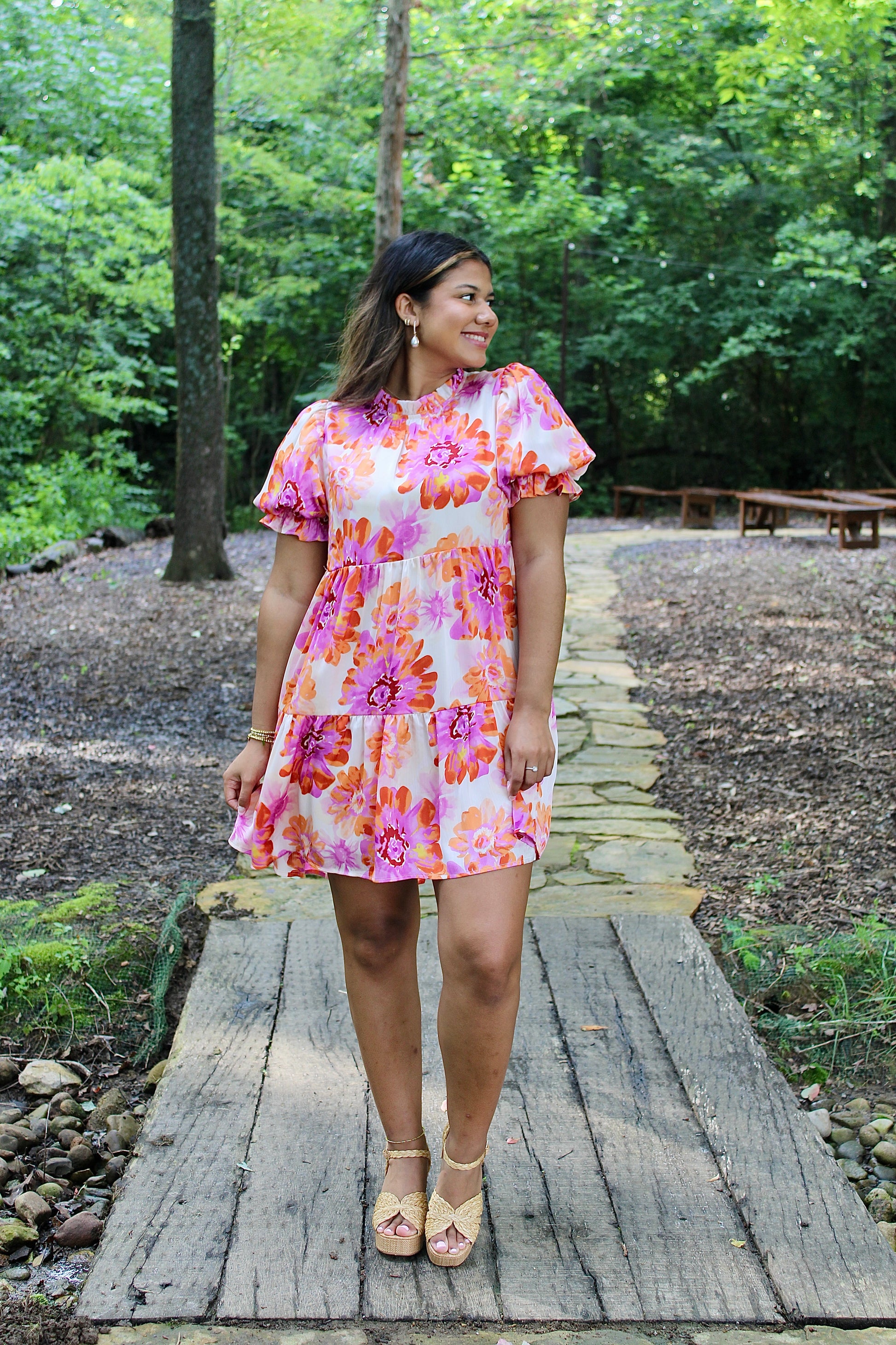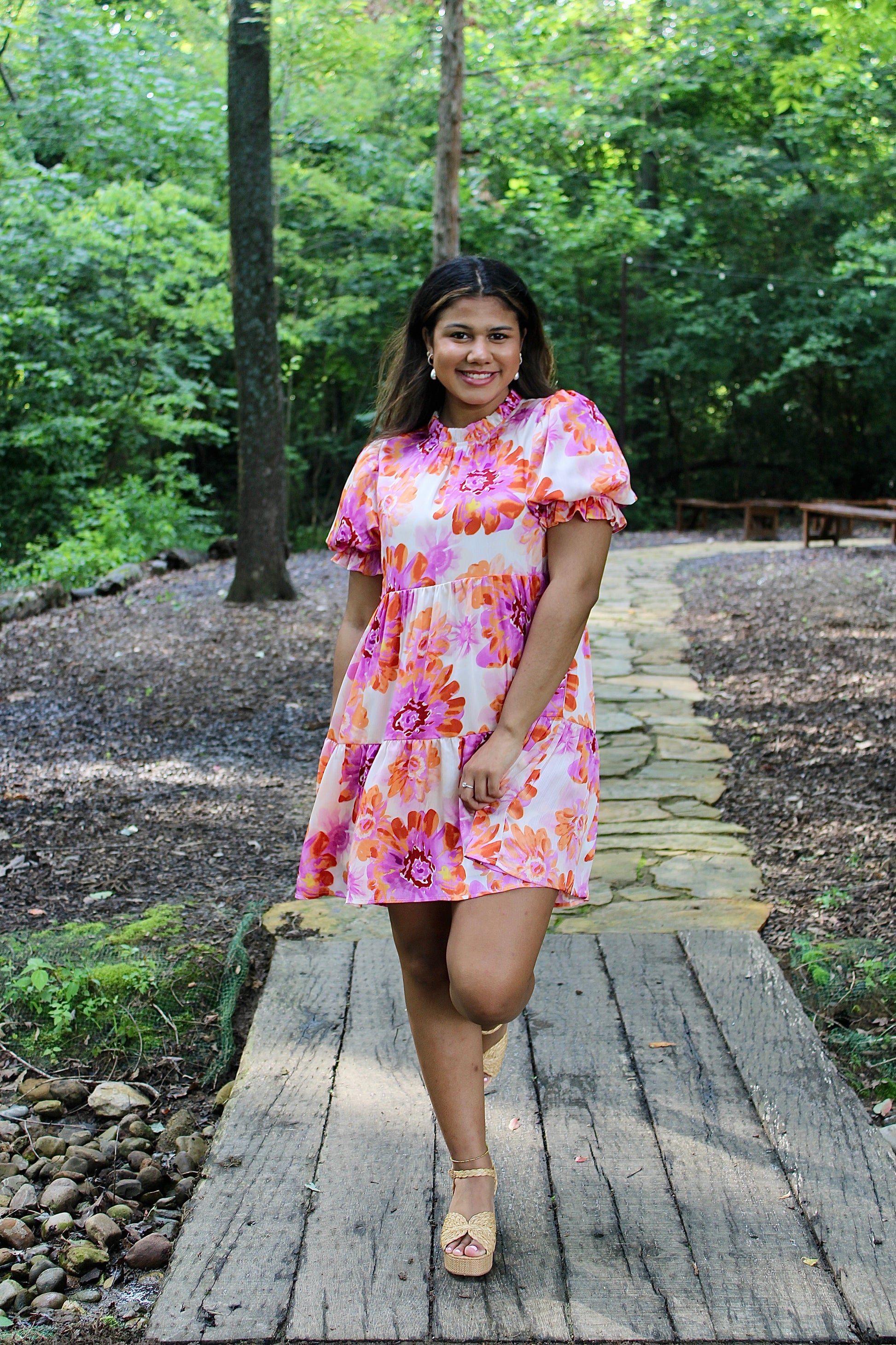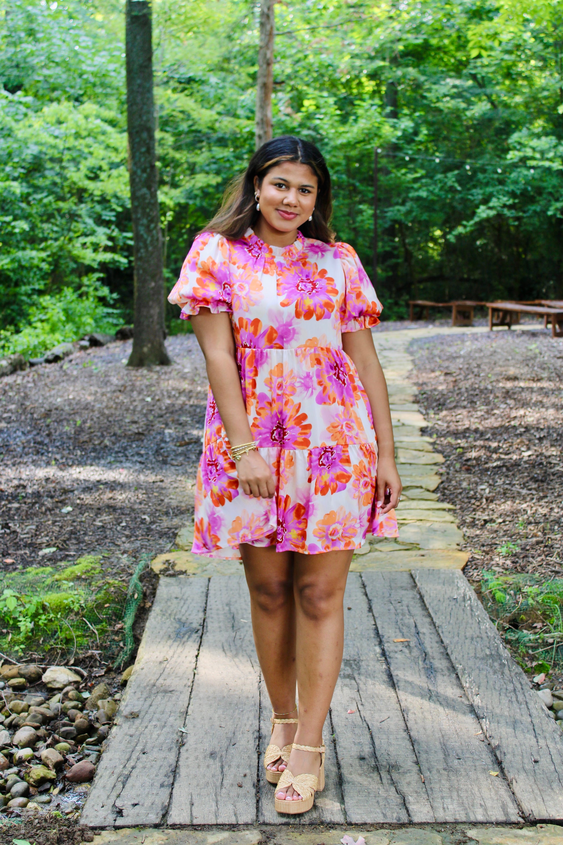 Flower print dress with frilled neck, back buttoned closure, short poet sleeves, and wide ruffled hemline.