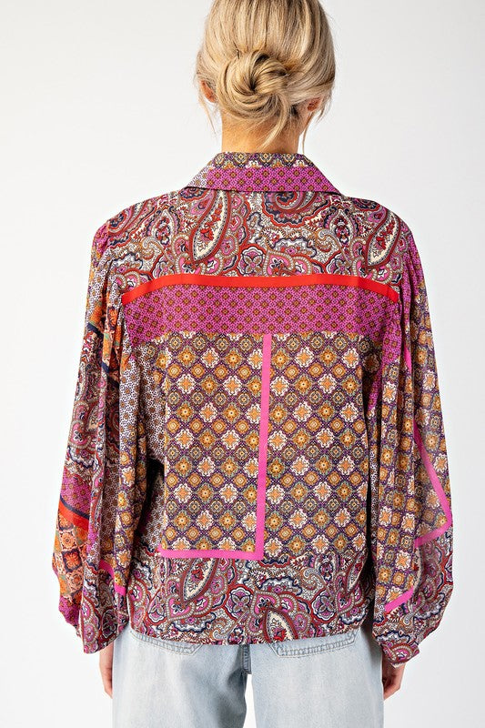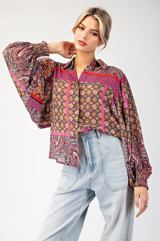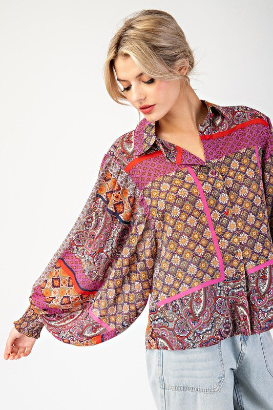 Boho collared long sleeve top with smocked cuffs, button front closure, and puff sleeves. Flowy top that's easy to wear!