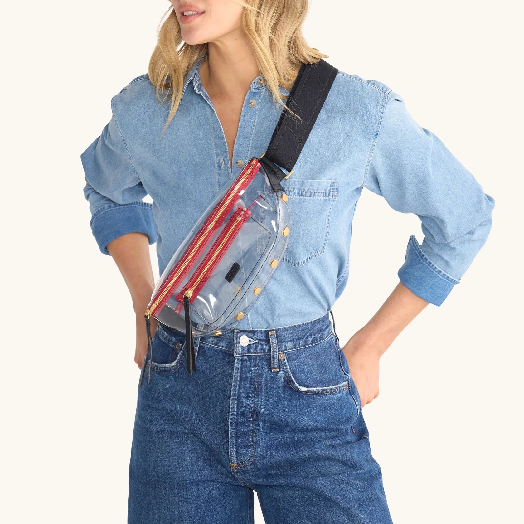 This updated take on our internet famous belt bag embraces the crossbody styling our fans have come to love, with size inclusivity in mind and a clear, stadium-approved twist. Plus, its long strap allows you to truly wear this style as a low slung crossbody, in addition to over your chest. Adorned with a hint of our signature soft pebbled leather with a hint of shine featuring a warm medium brown hue, brushed gold hardware and red zipper combo, this pairing will have you celebrating in the end zone.