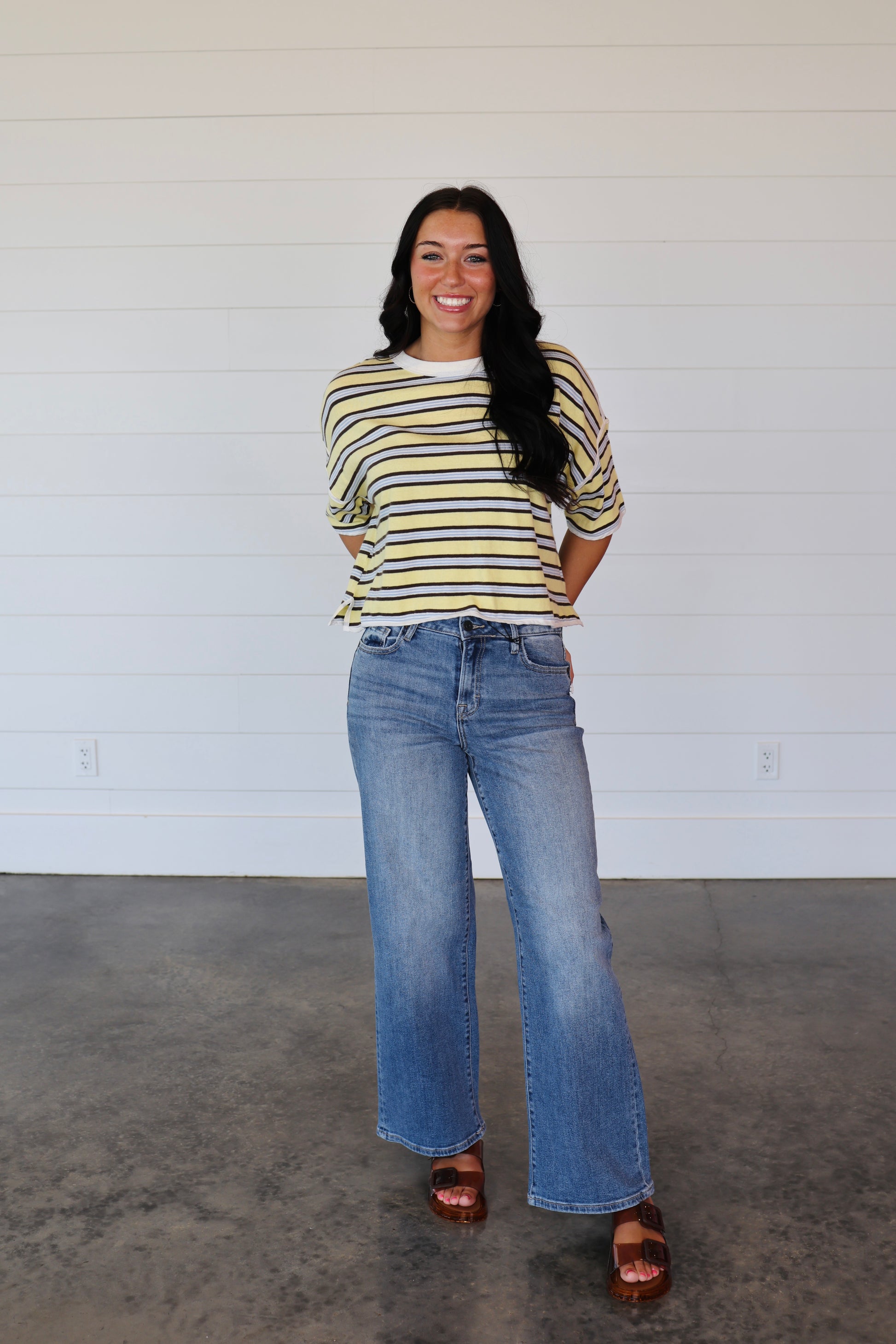Sporty, retro, comfy–we’re bringing all of our favorite vibes into one tee with this staple option from We The Free, featured in a cropped, boxy fit with a fun striped print and extra wide short sleeves.