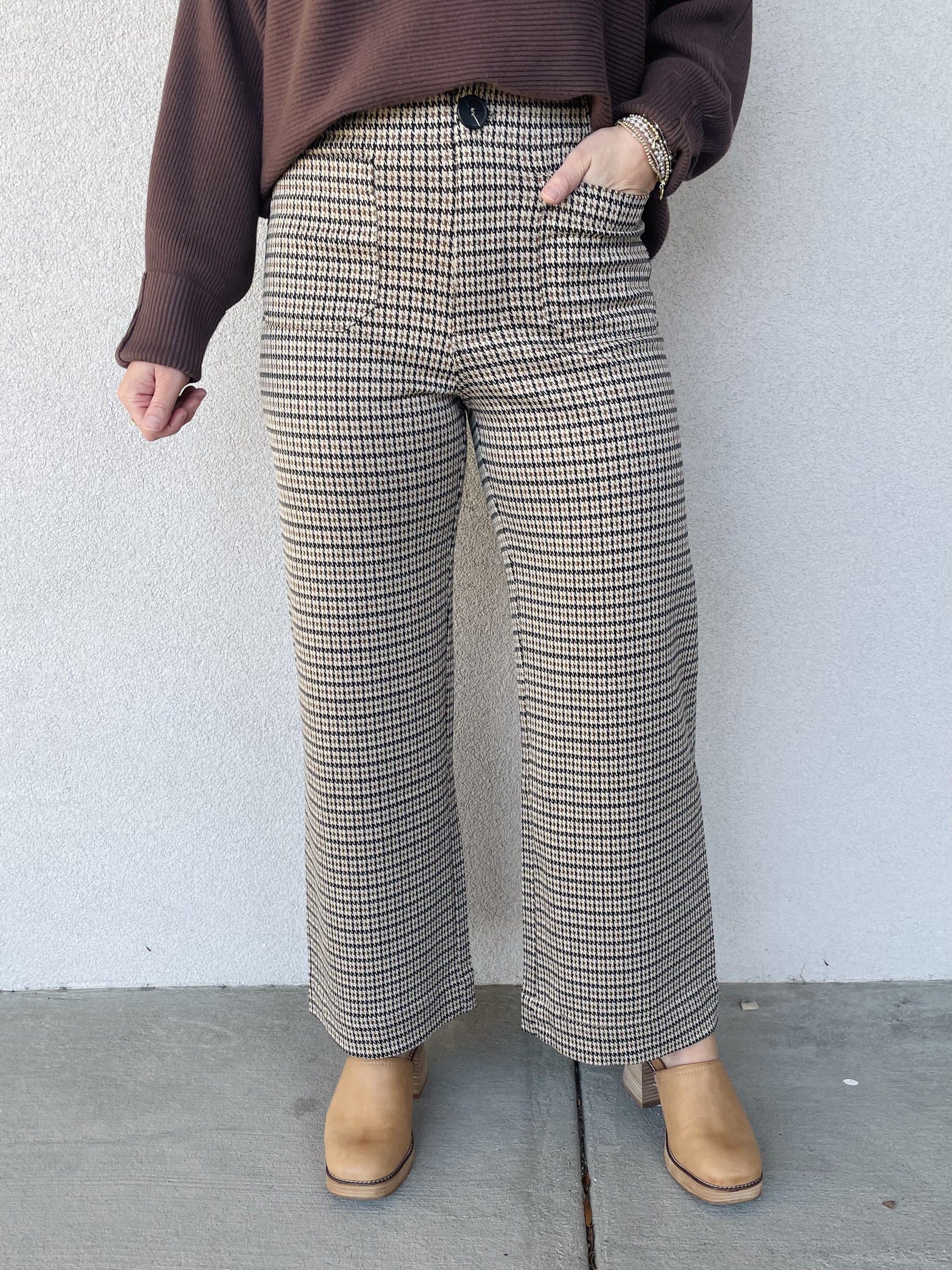 These pants showcase an allover micro houndstooth pattern, subtle front seam detailing, front and back patch pockets, and a straight leg silhouette with a button and zipper closure for a tailored yet modern look.