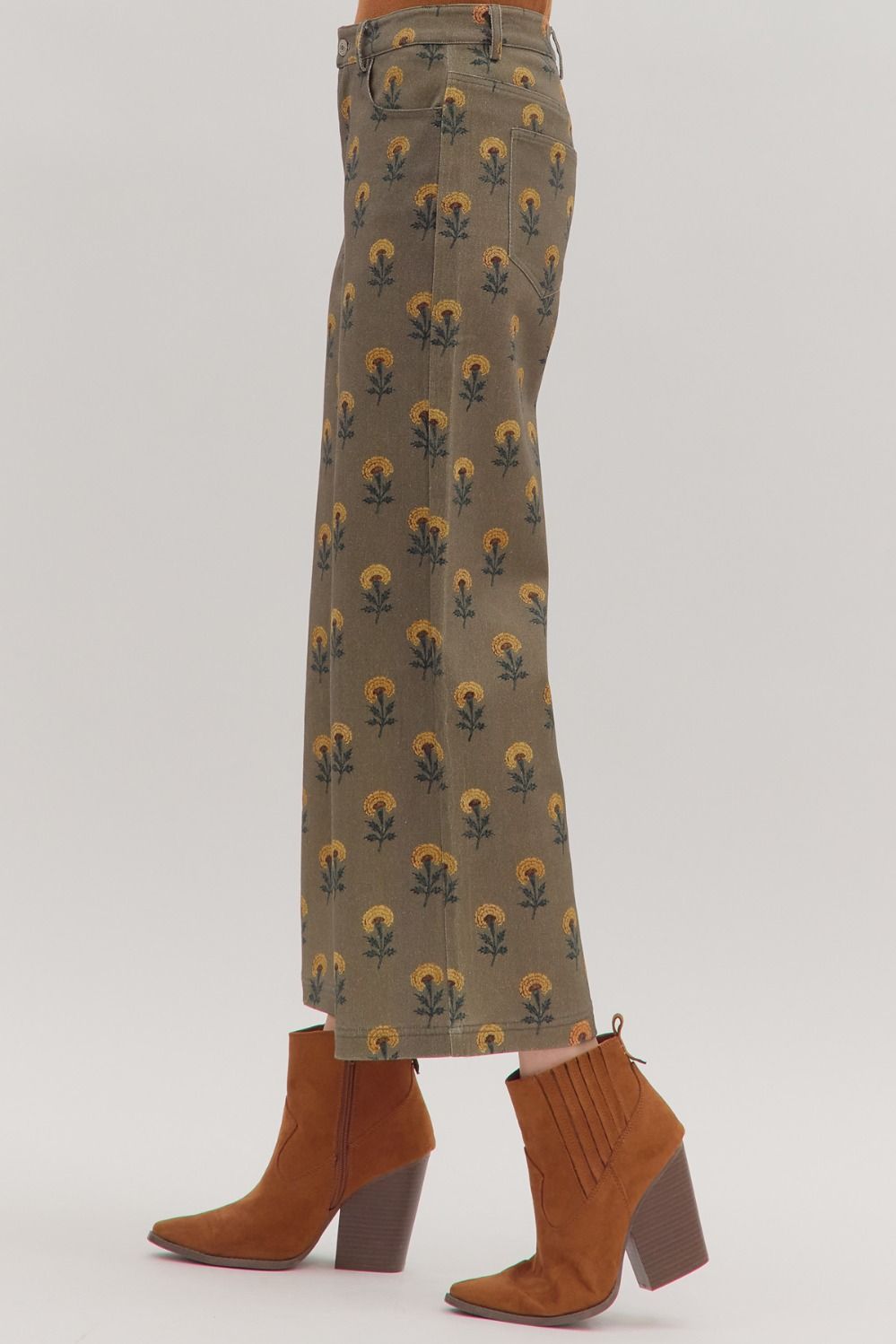 Botanical print wide-leg pants featuring zip-fly button front closure and belt loops. Front/back patch pockets.