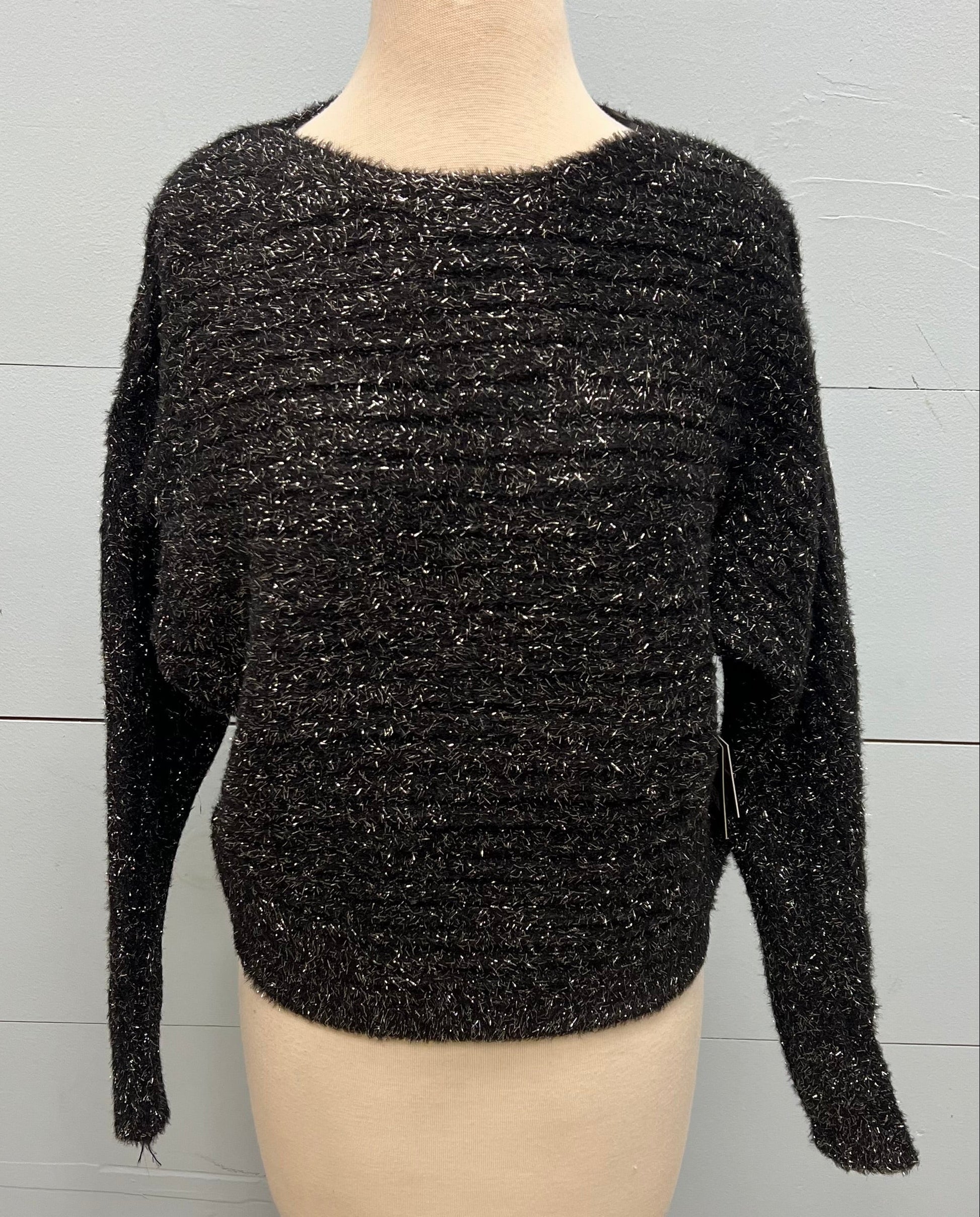 Wrap yourself in cozy elegance with this black fuzzy sweater, woven with subtle metallic threads that catch the light just right. The soft, textured knit adds a touch of glam to your everyday look while keeping you warm and comfortable. Designed with a relaxed fit and ribbed hem, it pairs effortlessly with jeans or faux leather pants for a chic, night-out vibe or a festive winter look.