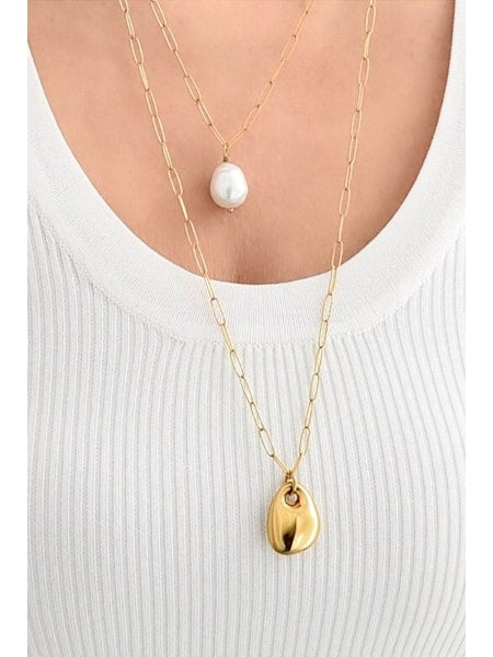 The Double Down Necklace offers elegant layering with a drop pearl on the first layer and a gold teardrop medallion on the second. This two-layer design combines simplicity and sophistication for a timeless, refined look.
