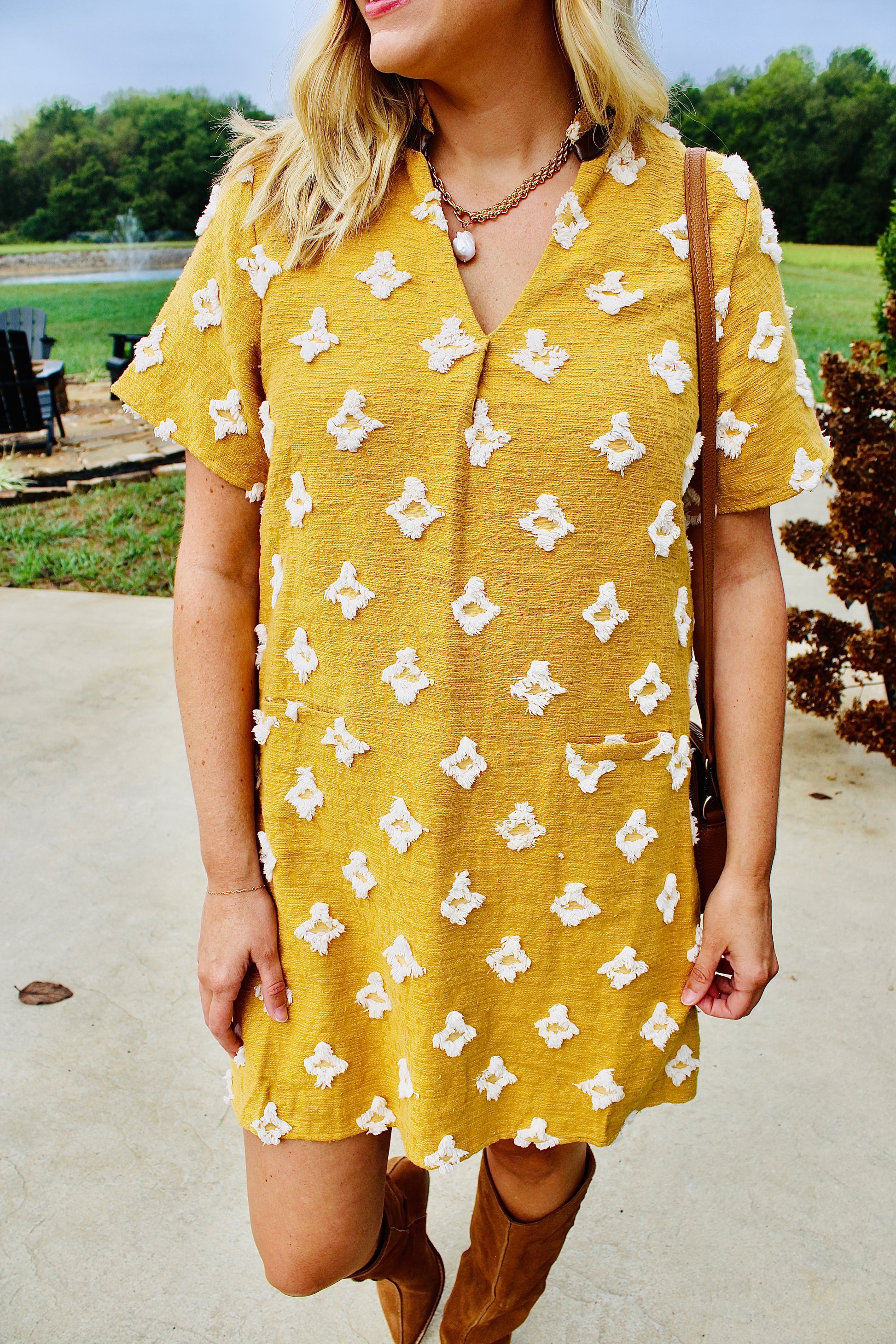 Short sleeves detailed mustard dress