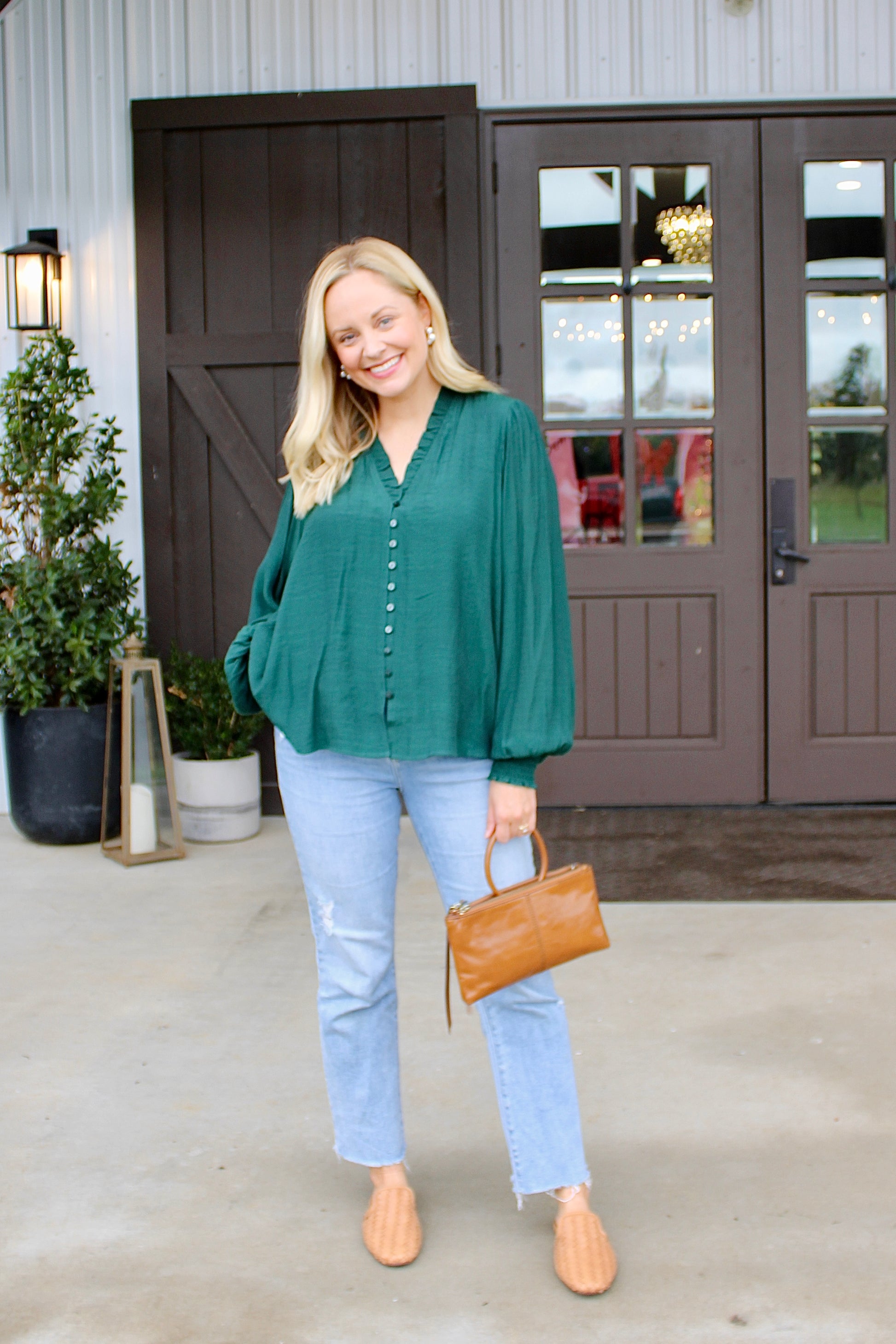Work or weekend, this blouse is a versatile option you'll wear on repeat. Lightweight and woven with a subtle sheen, it features a ruffle stand collar, a button-down front, and balloon sleeves with smocked cuffs. Tuck this relaxed-fit blouse into tailored trousers and team with loafers for a polished finish that's perfect for office to off-duty wear.