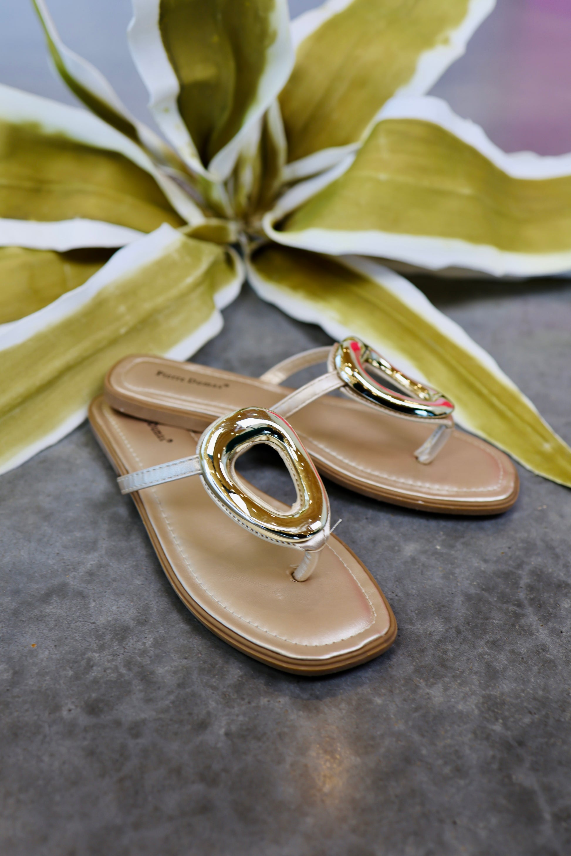 A sleek and effortless sandal designed for everyday elegance. This flat thong sandal features a smooth, neutral-toned upper accented with a bold, polished metal oval detail that adds a modern, refined touch. The cushioned footbed provides all-day comfort, while the low-profile sole makes it perfect for warm-weather wear. Easy to slip on and endlessly versatile, this sandal pairs beautifully with dresses, linen pants, or casual denim for a chic, relaxed look.