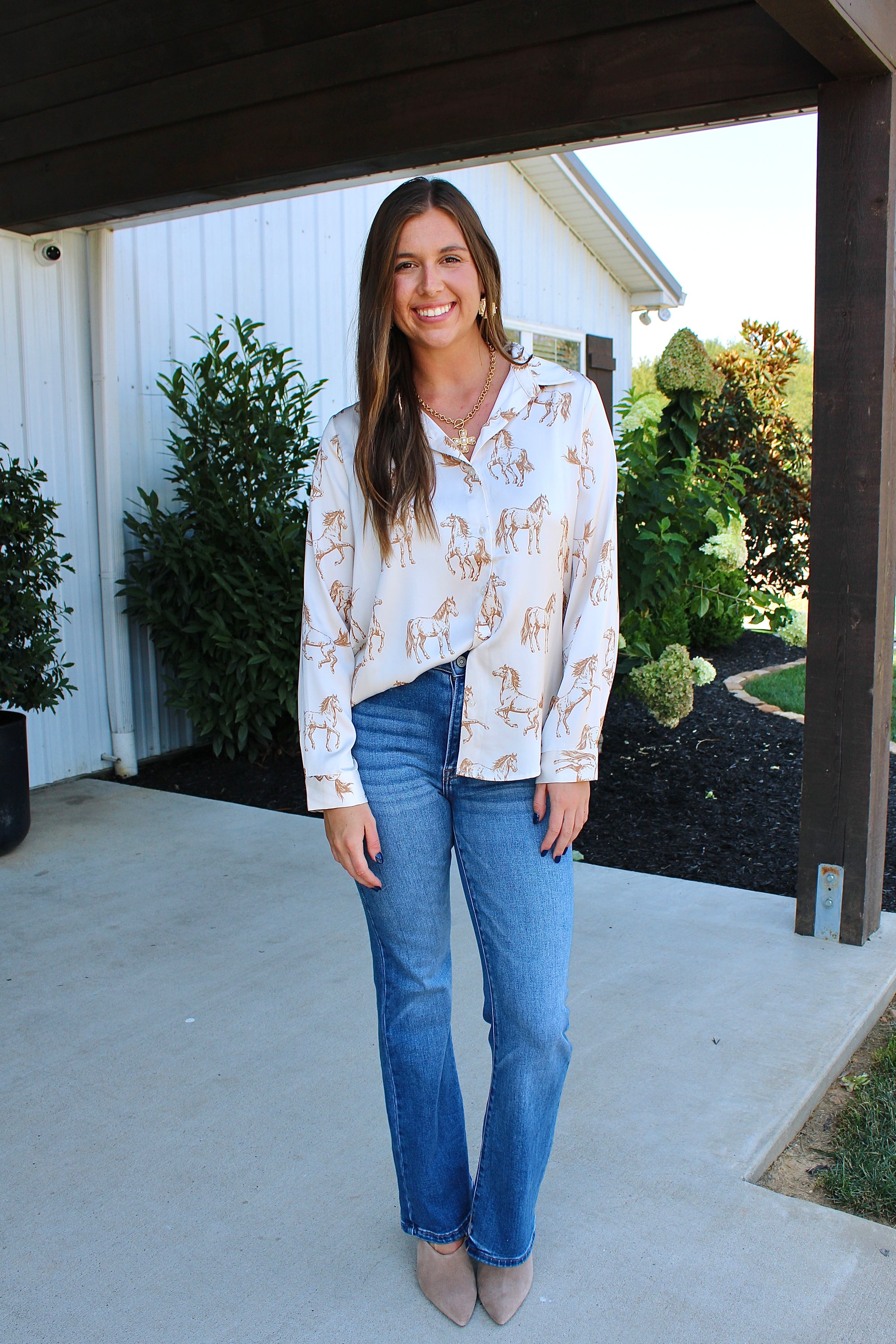 Polished yet playful, this satin blouse features a luxe horse print. Designed with a classic collar and button-down front, bringing an elevated feel to your everyday look.