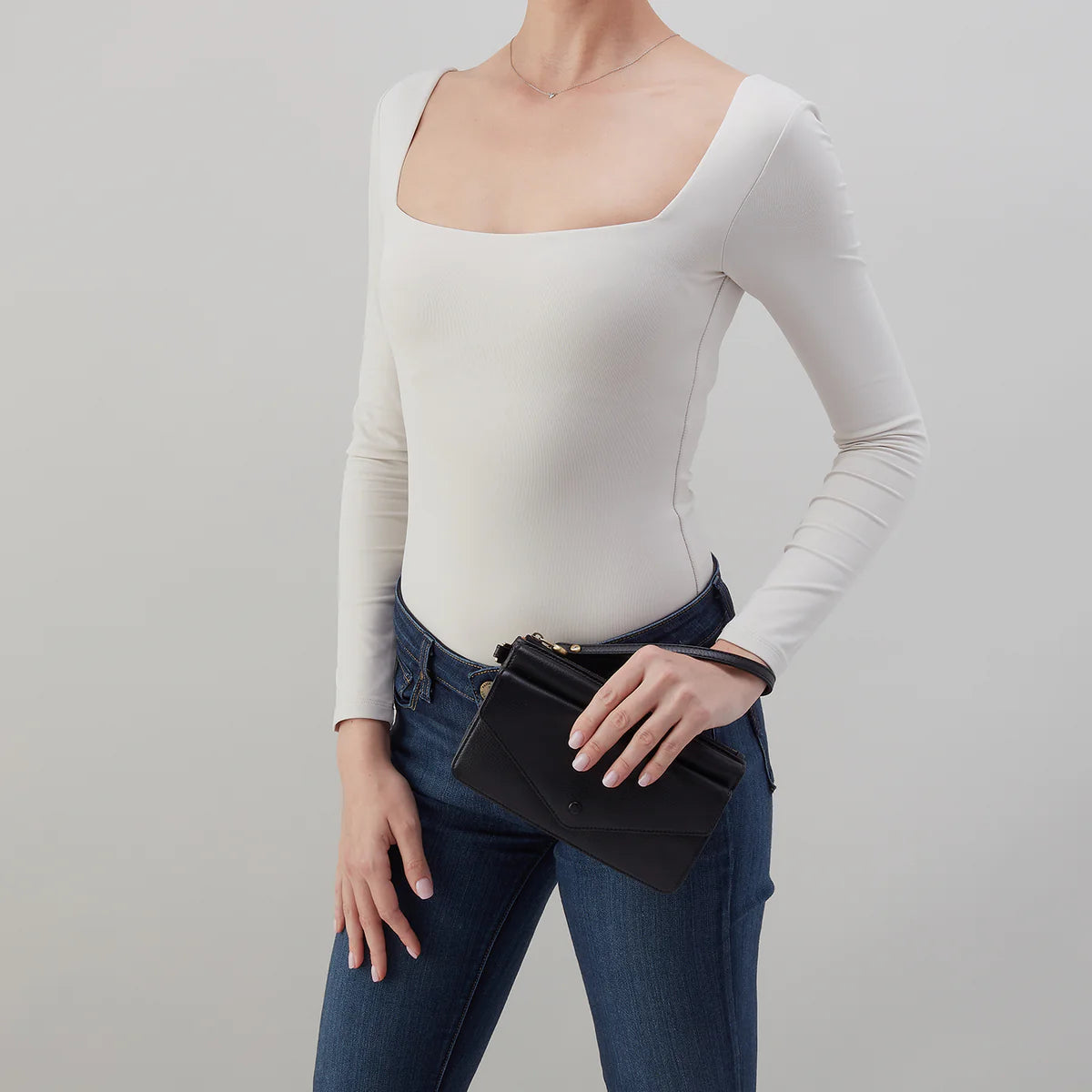 Use the D-ring to attach your keys or clip on your removable wristlet strap.