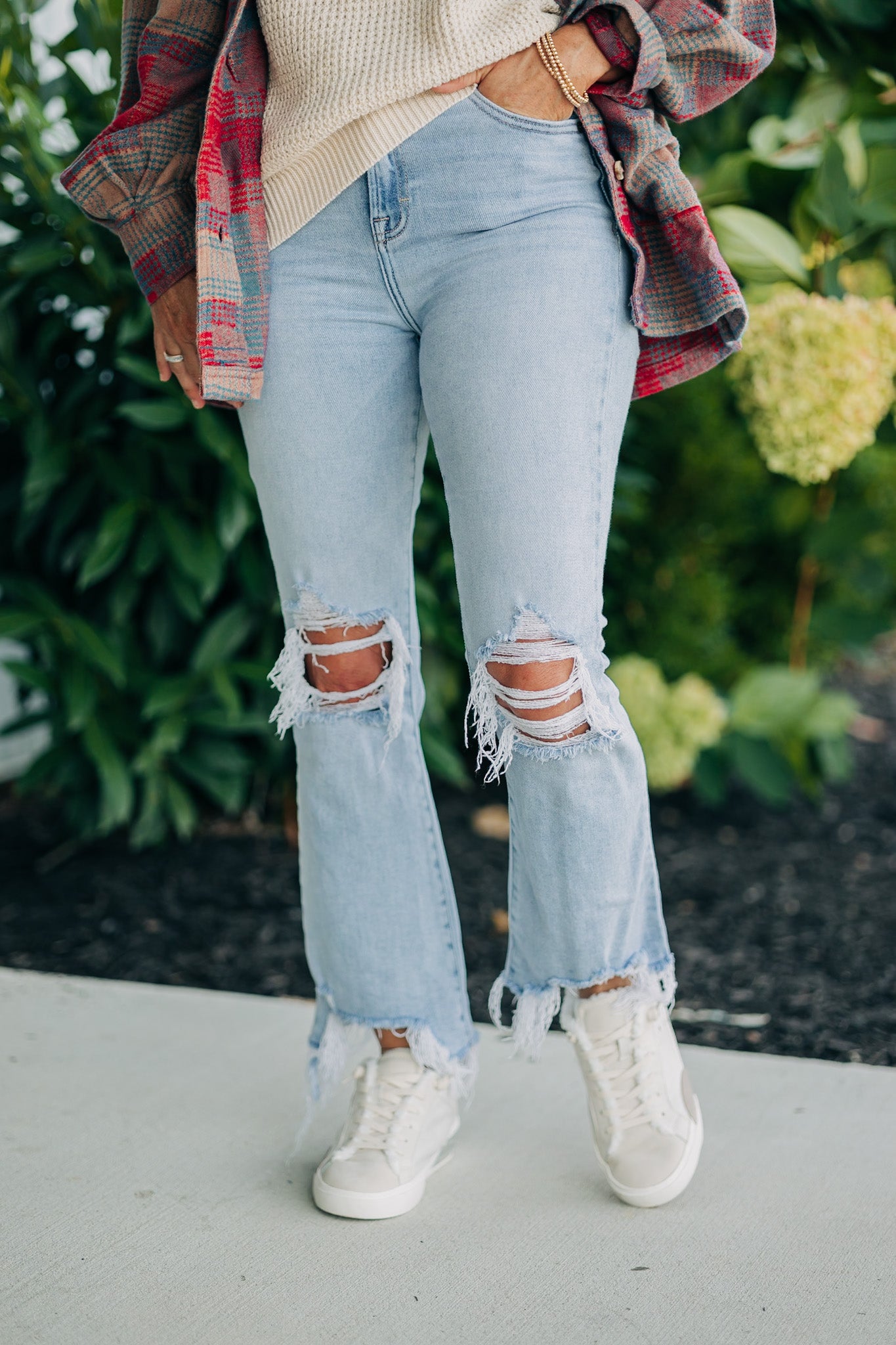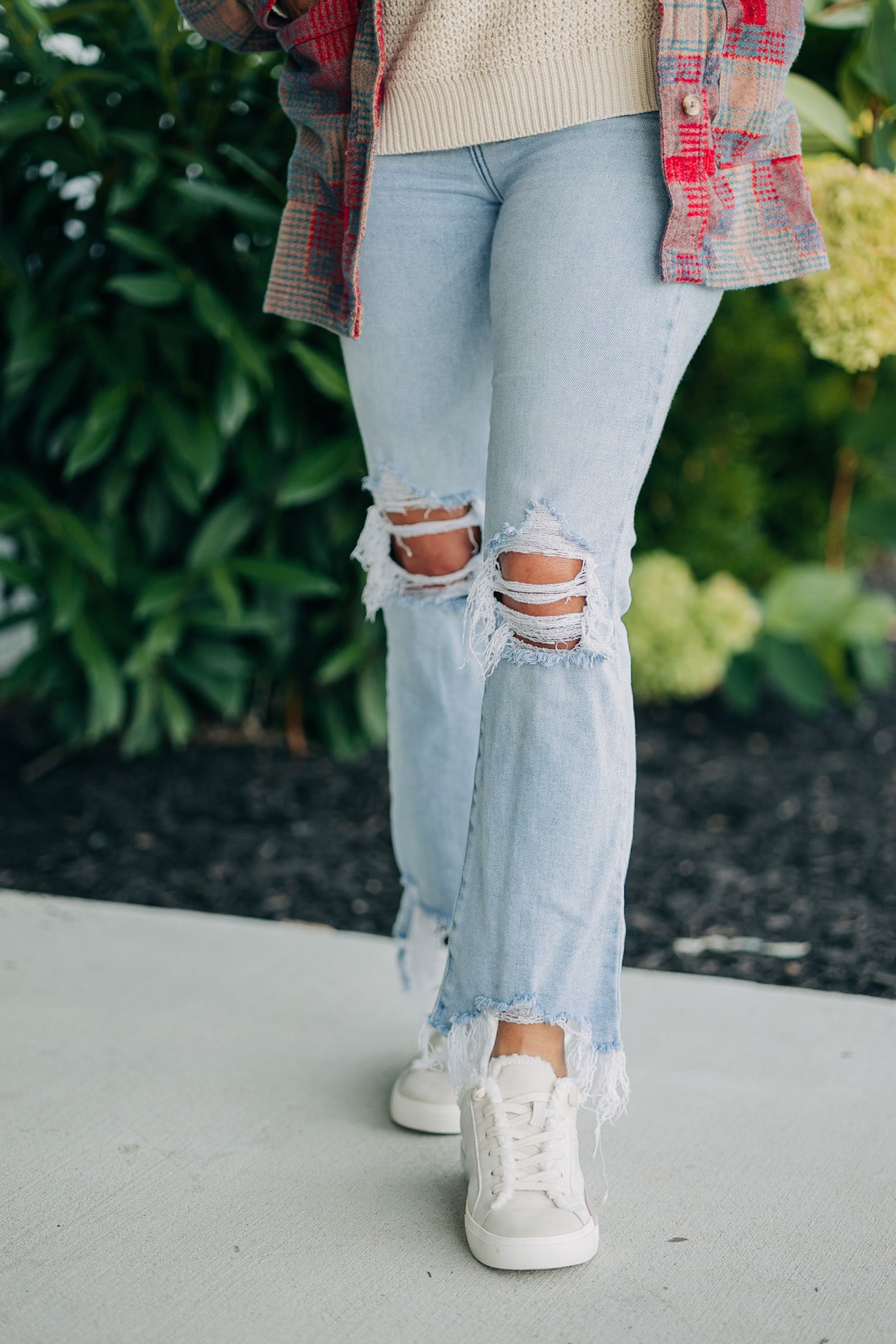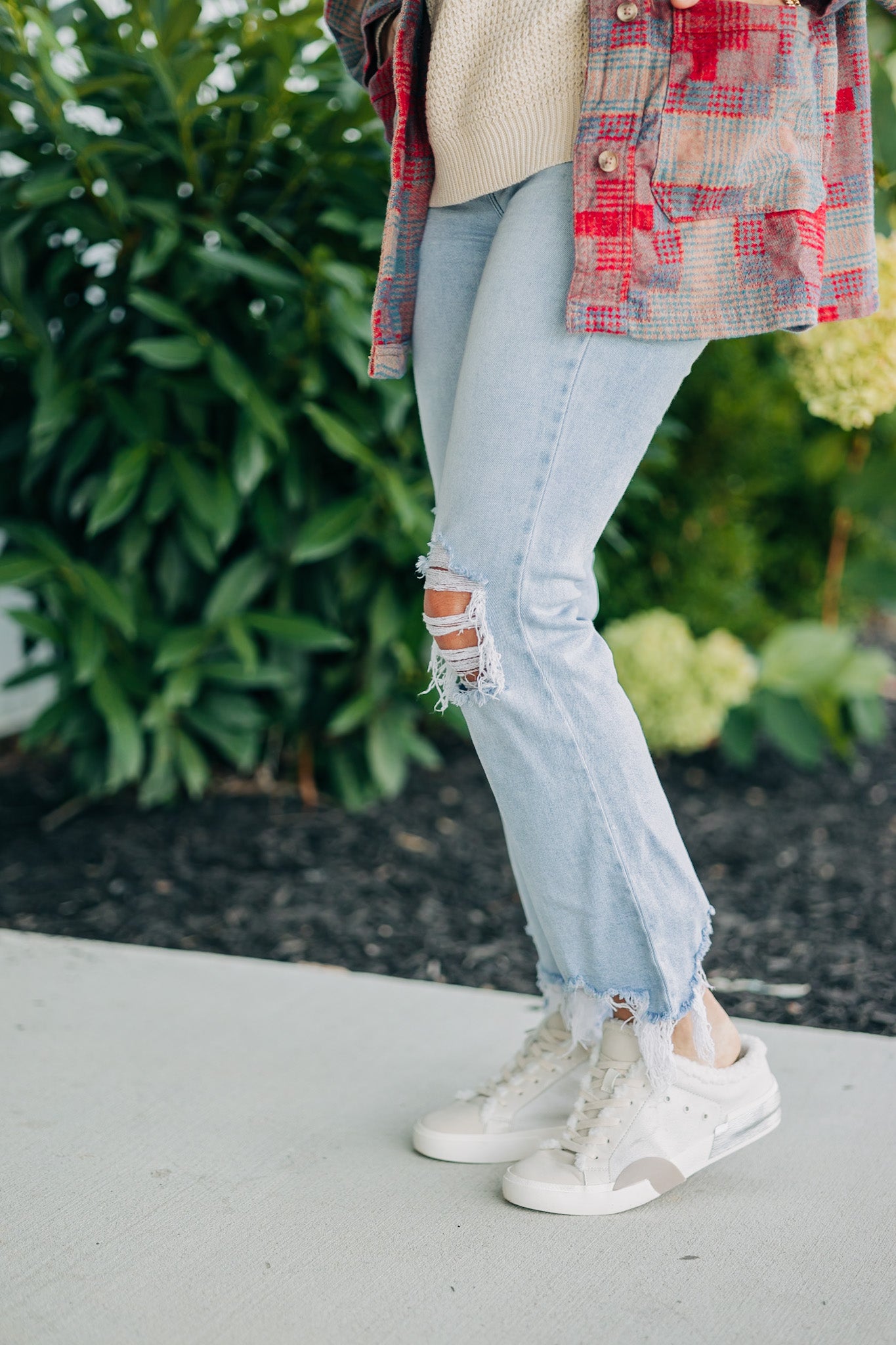 Distressed frayed hem denim pants