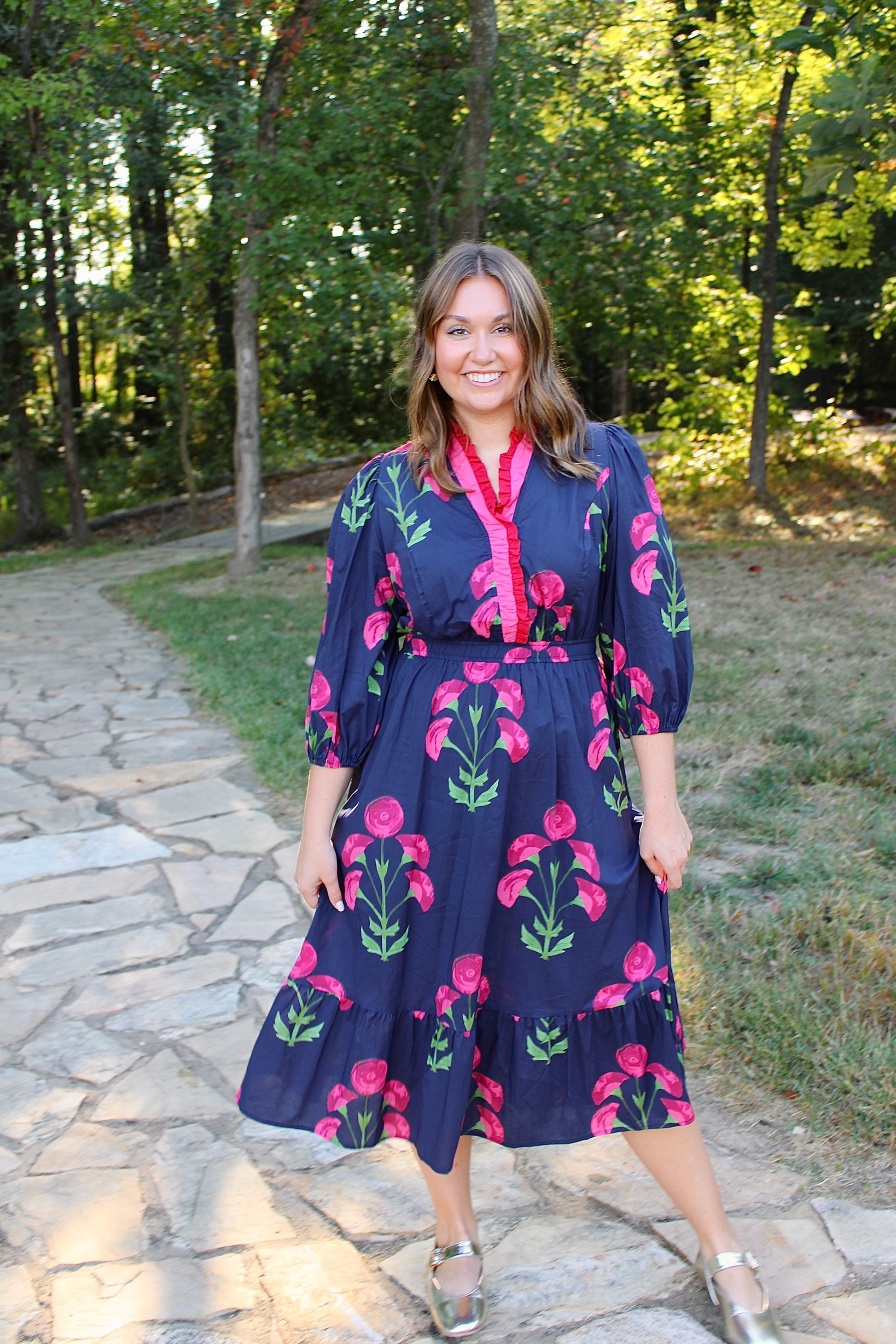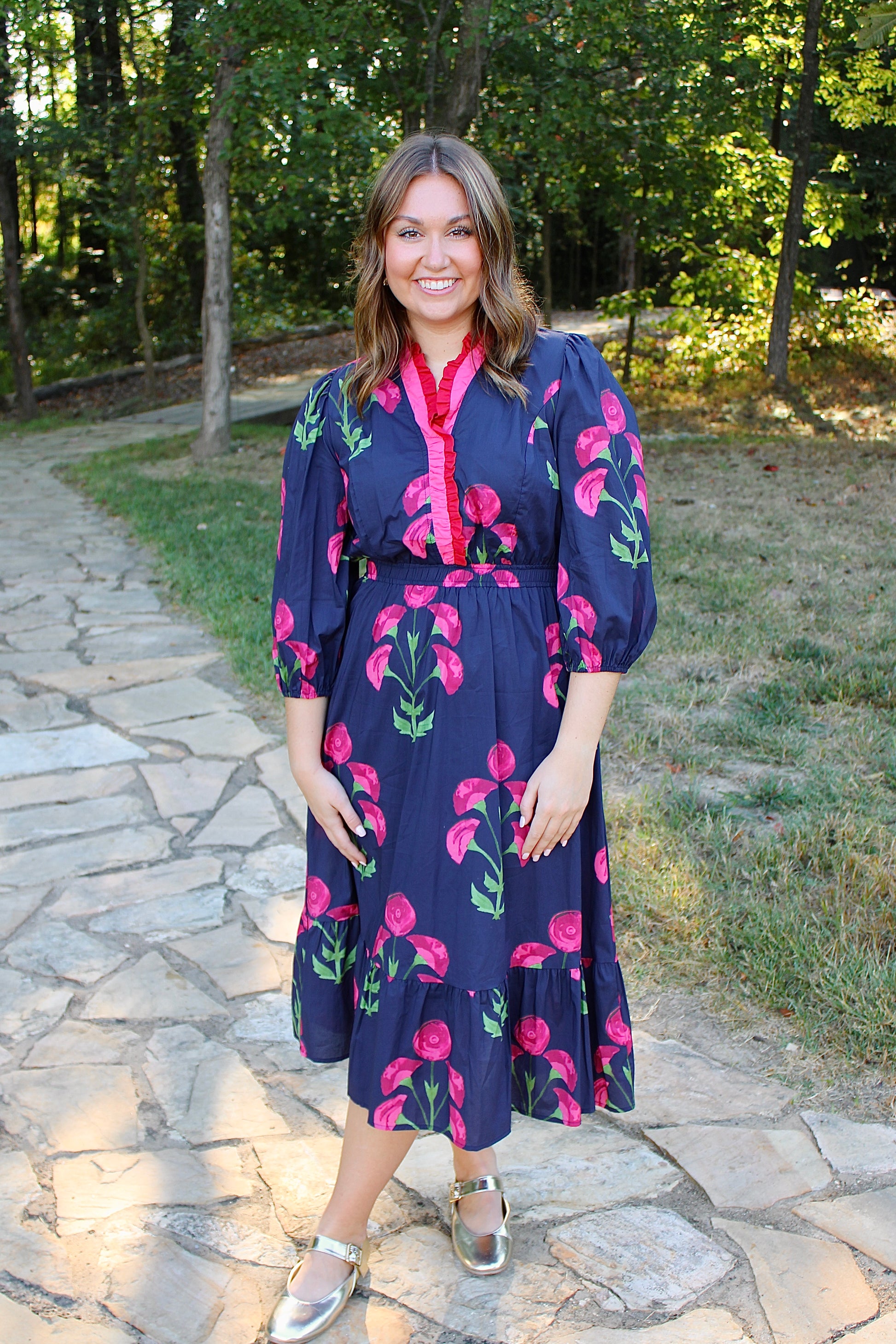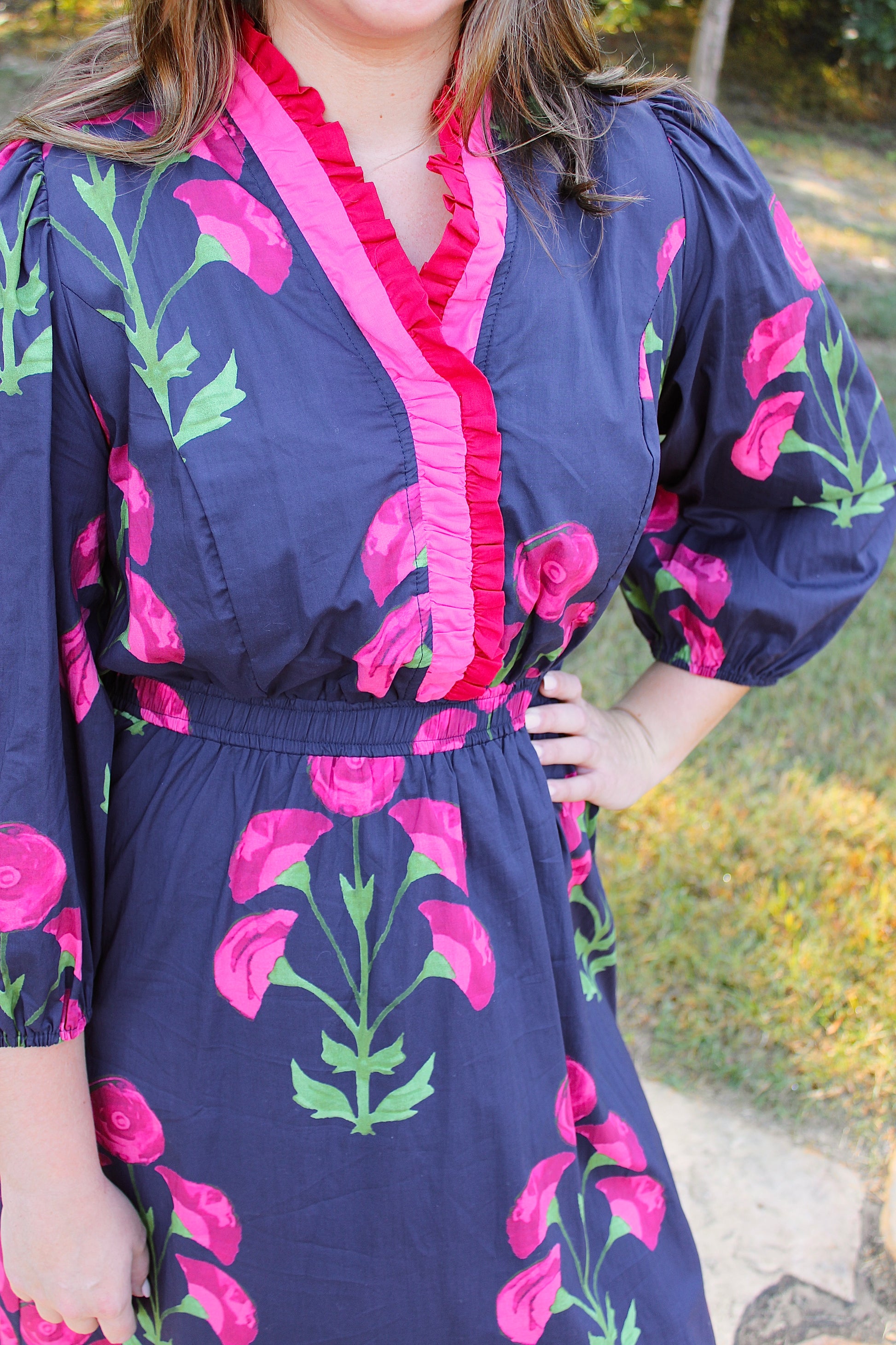 Floral Midi Dress with Ruffle Trim and Elastic Waist