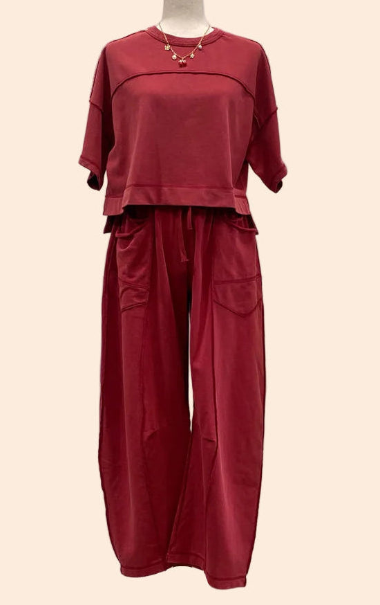 Elevate casualwear with this mineral washed two-piece set, featuring a relaxed boxy top and barrel pants with exposed seam detail. The elastic drawstring waist and oversized cargo pockets bring comfort and function, while the washed finish adds a lived-in, boutique-ready edge. A versatile lounge-to-street look that is effortless for layering or standout styling.