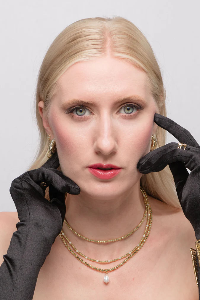 Gold filled is a great choice for those not willing to sacrifice their poolside accessories. Each gold filled piece is made by bonding the gold to the metal underneath (for us that is brass or sterling silver). Gold filled pieces can stand up to regular encounters with water, perfumes and oils. While the piece may darken over time, they will not turn to reveal another color underneath.