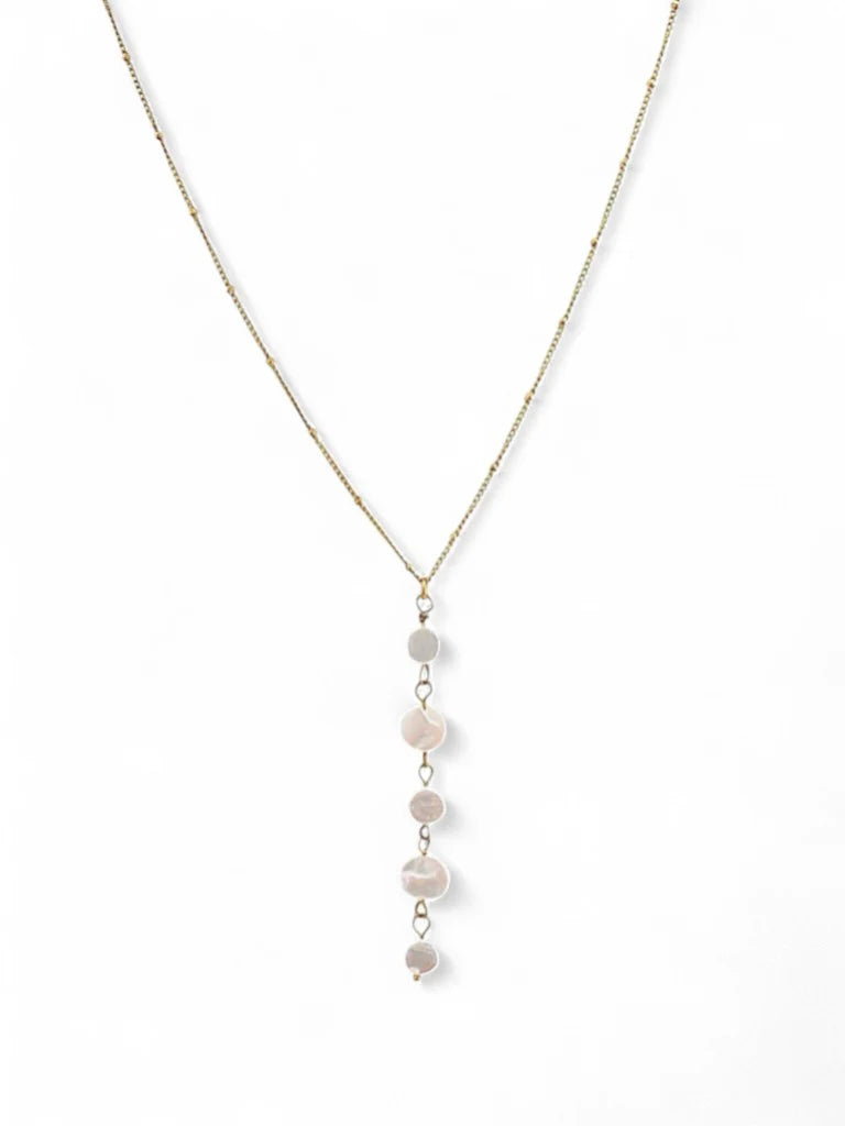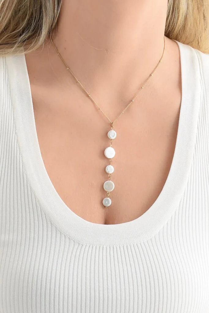 Elegant and modern, the Laced in Light Necklace features flat pearl beads that gracefully cascade down into a long, stunning lariat drop. This necklace brings a touch of sophistication and fluidity to any outfit, perfect for those who love minimalist yet impactful designs.