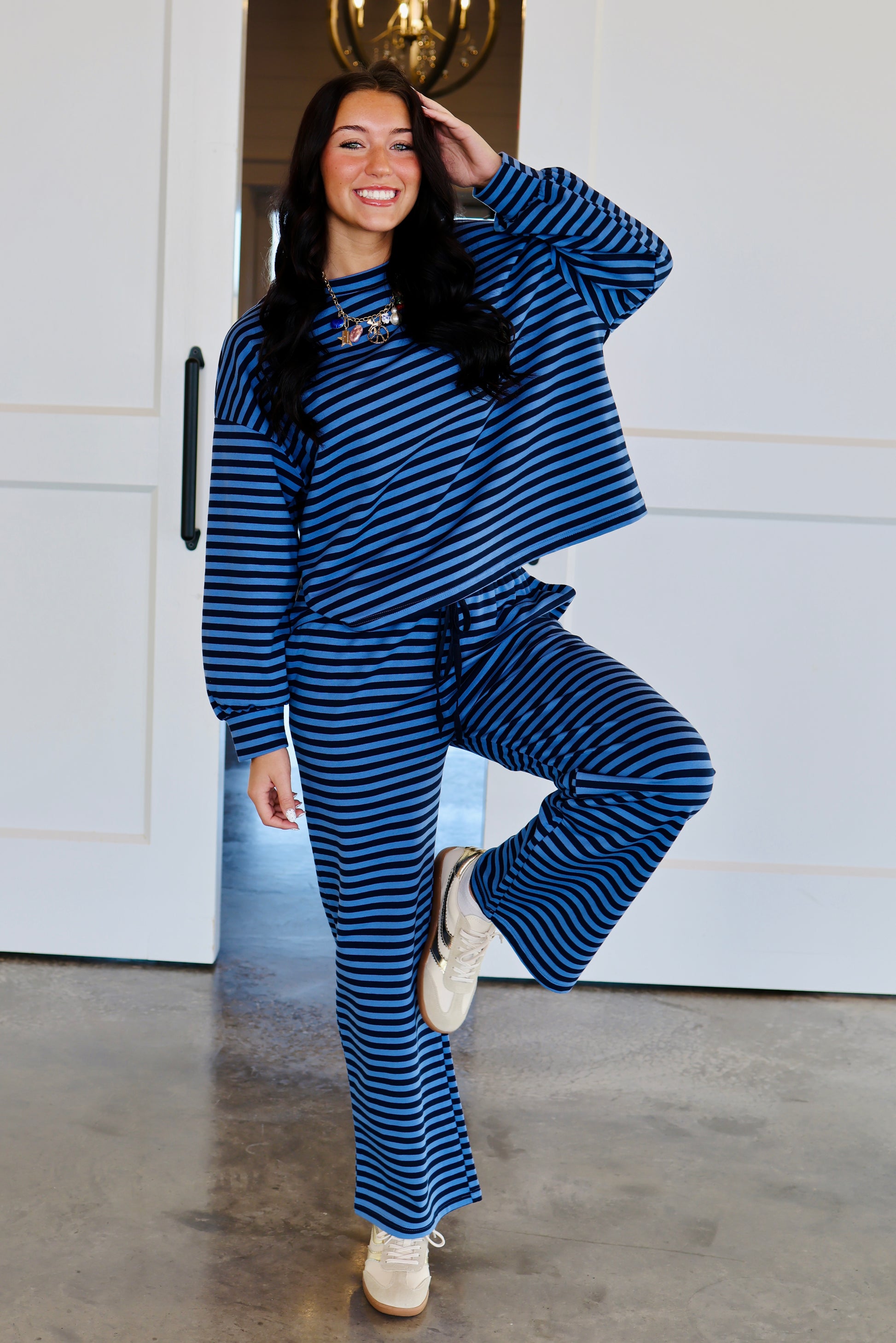Drawstring Waist Stripe Print Pants and Oversized Semi Crop Striped T-shirt Top SET
