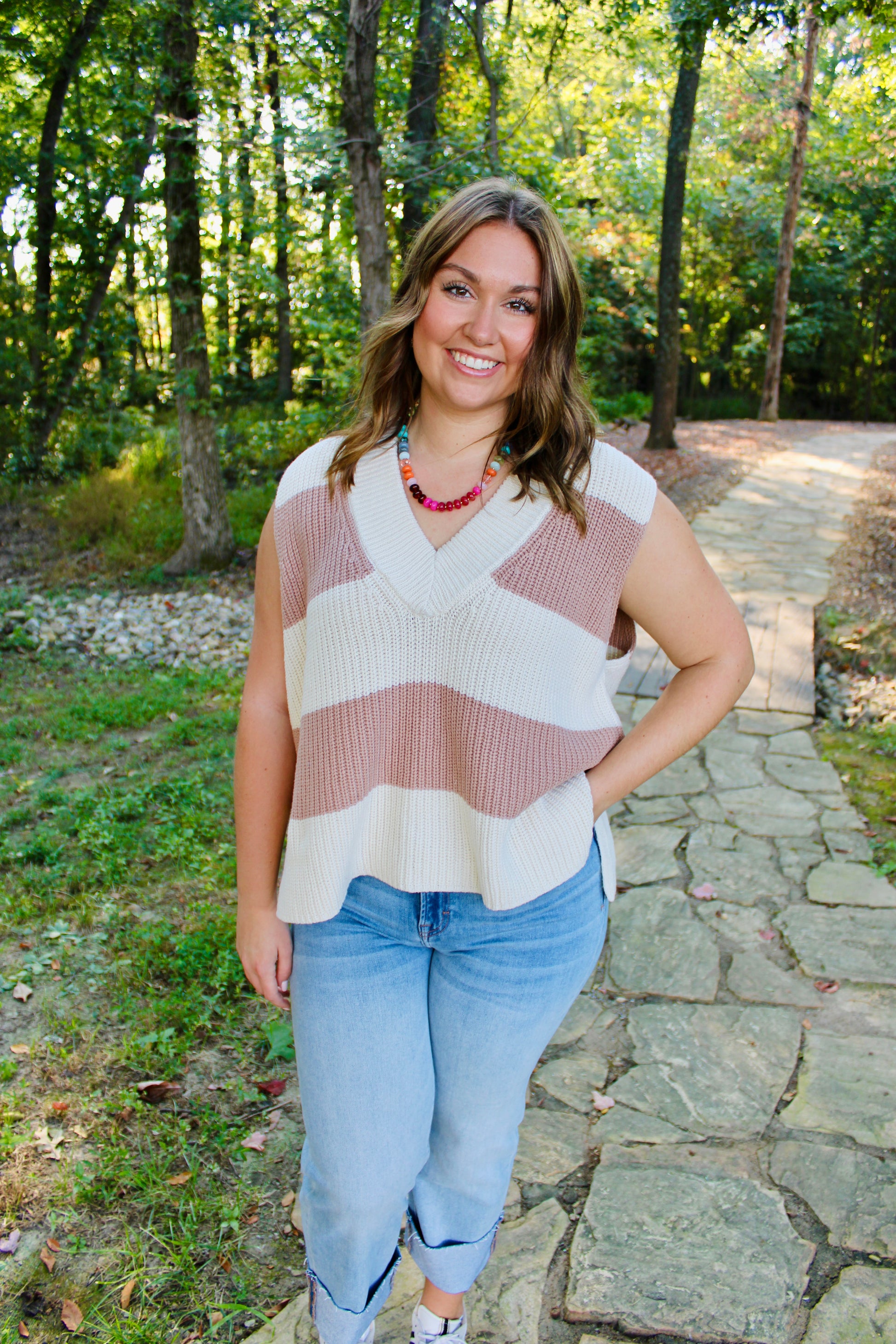 Put together all your favorite fits with this cute vest. Decorated with a striped pattern, this vest shapes a V-neckline with a sleeveless cut bodice. Side slit detailing amps up the look as the vest shapes a relaxed silhouette.