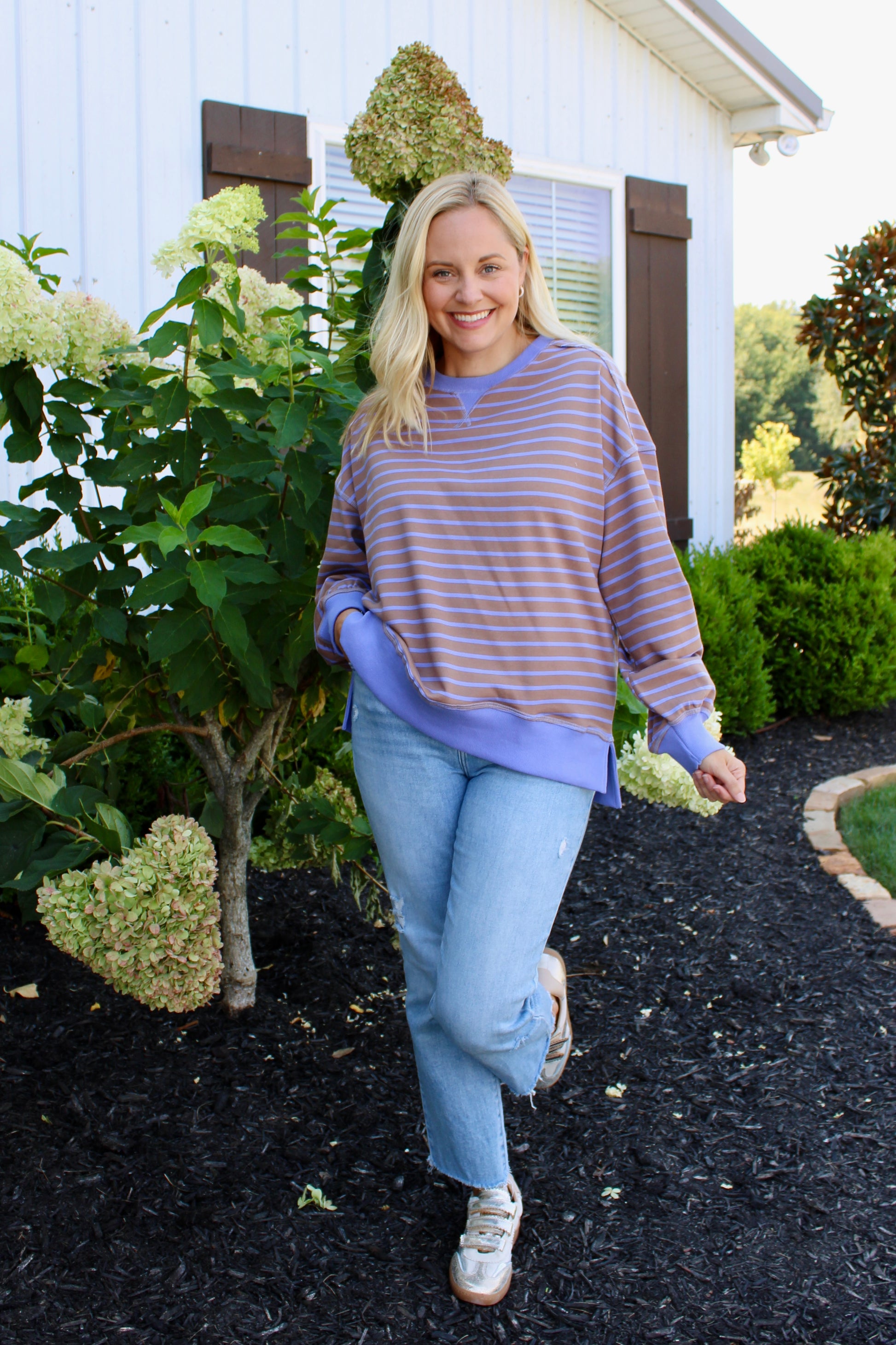 So cool and classic, this timeless crewneck top is featured in an oversized, slouchy silhouette and staple striped print.
