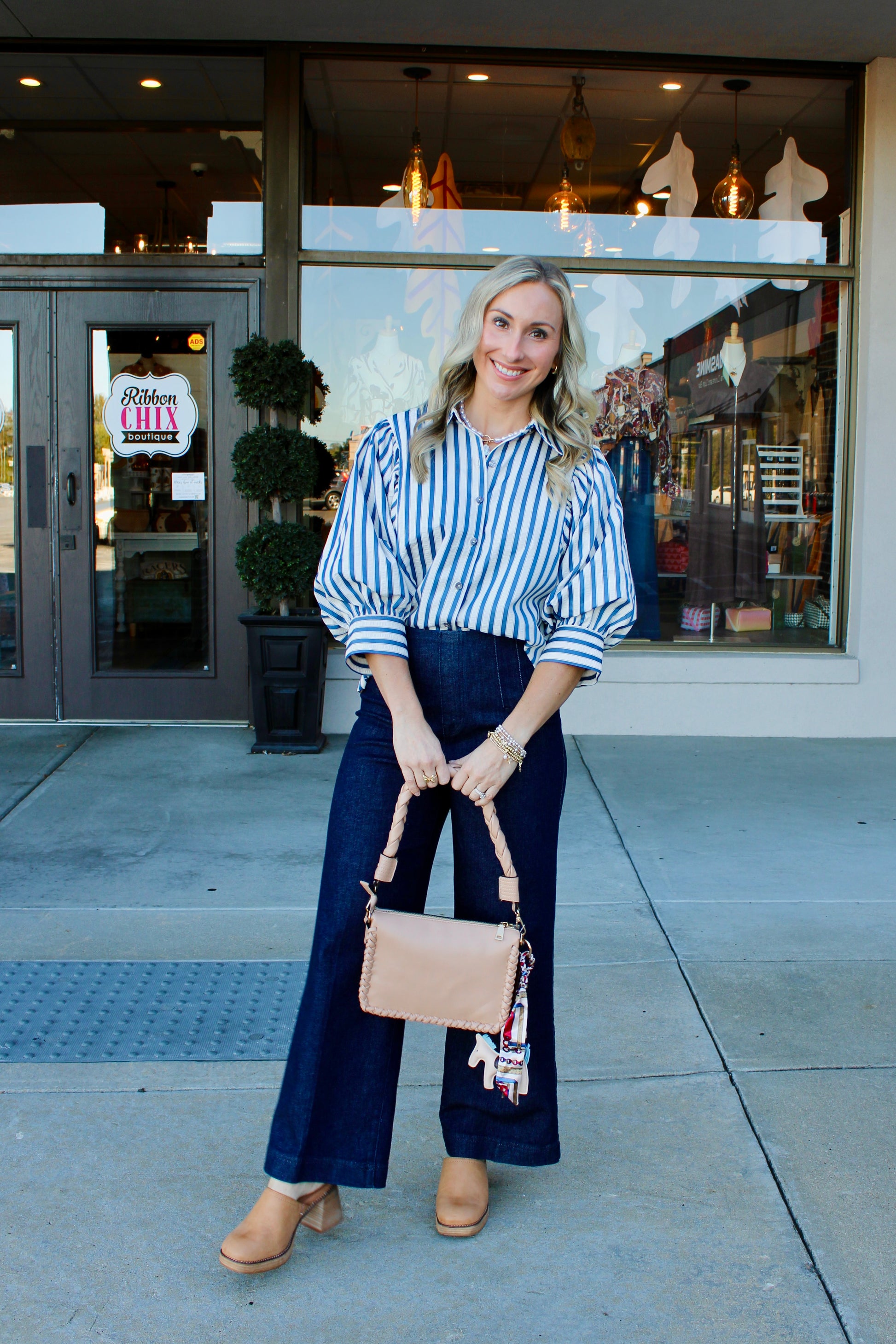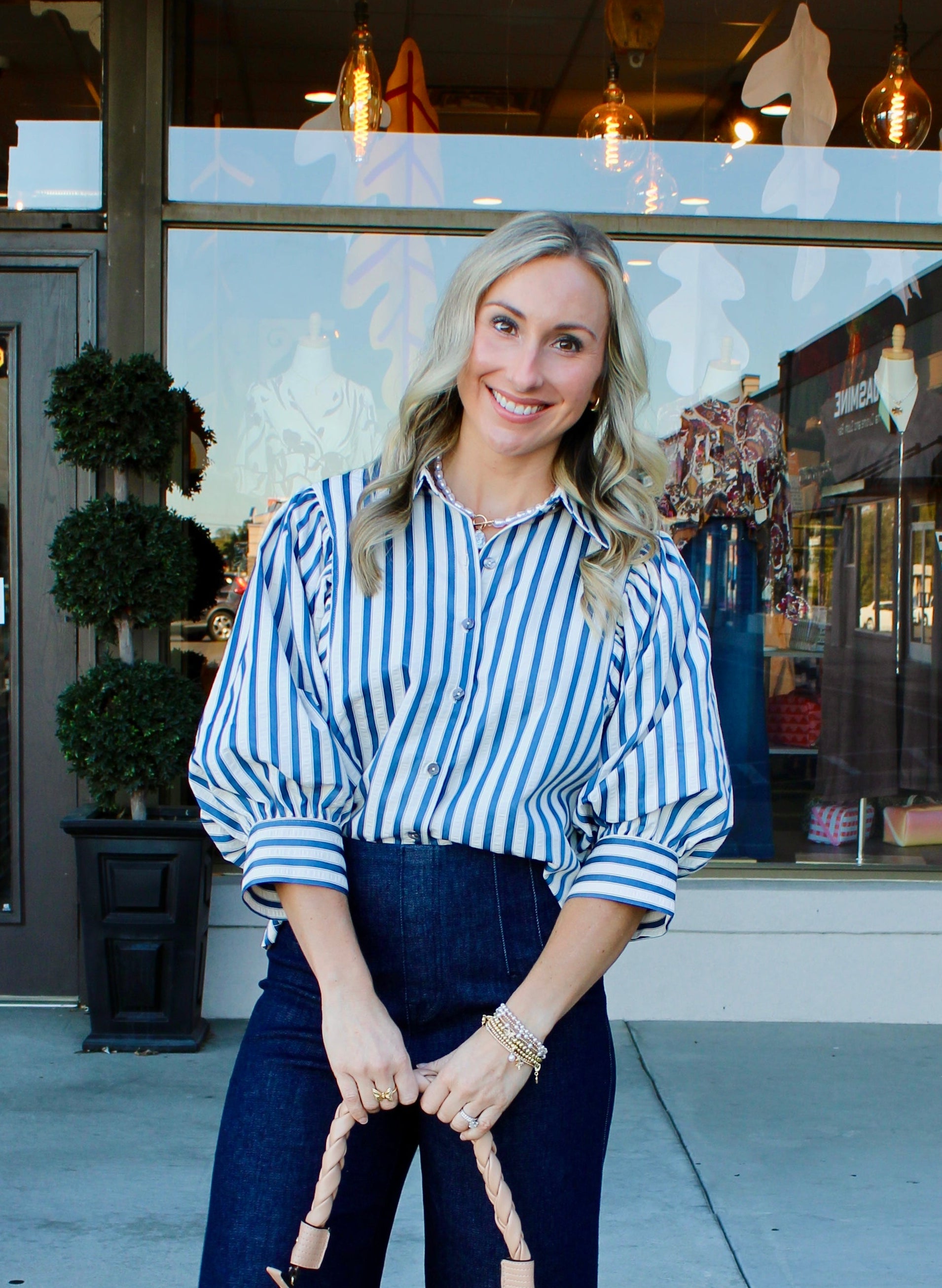 Striped 3/4 puff sleeve button-down top featuring point collar. Button closure at front.