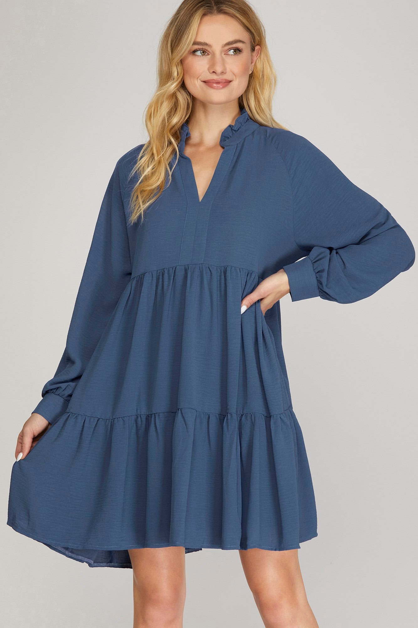 Long sleeve woven notched neck tiered dress