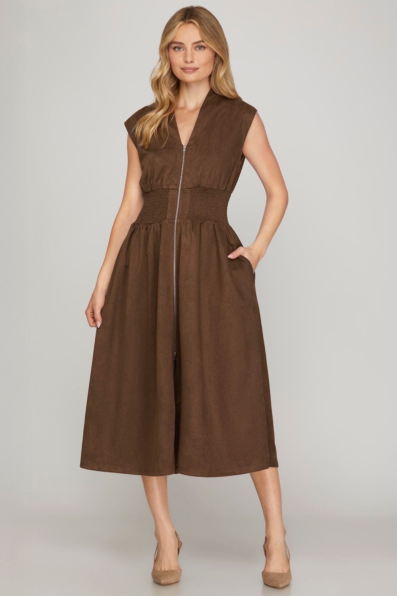 Drop shoulder smocked waist front zip sued midi dress