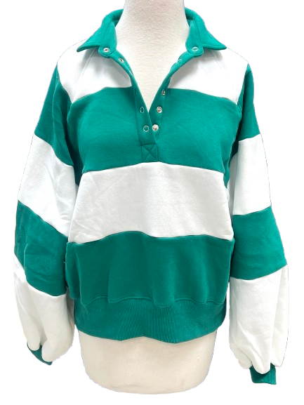 This rugby-style pullover is the perfect blend of sporty and chic! The bold green and white stripes give off major vintage vibes while feeling completely current. The oversized fit is so comfortable and the snap button placket adds authentic detailing.
