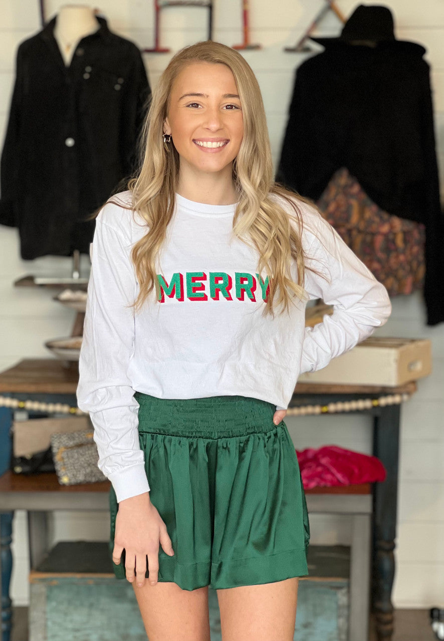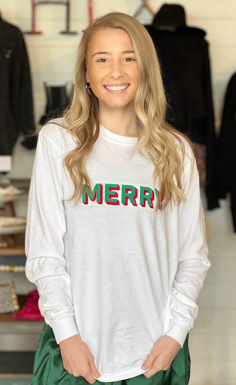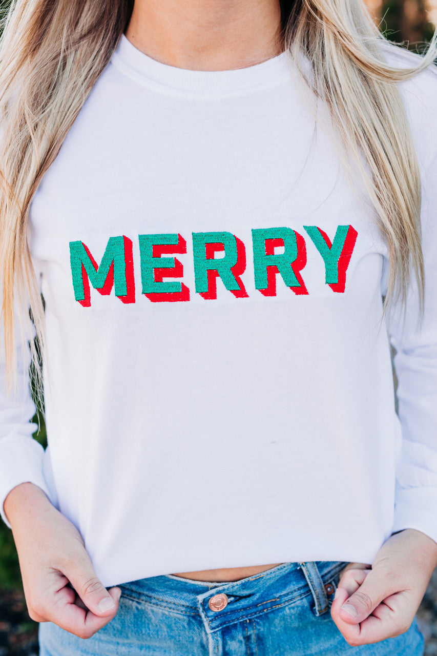 Long sleeve white shirt with retro green "Merry" embroidered.