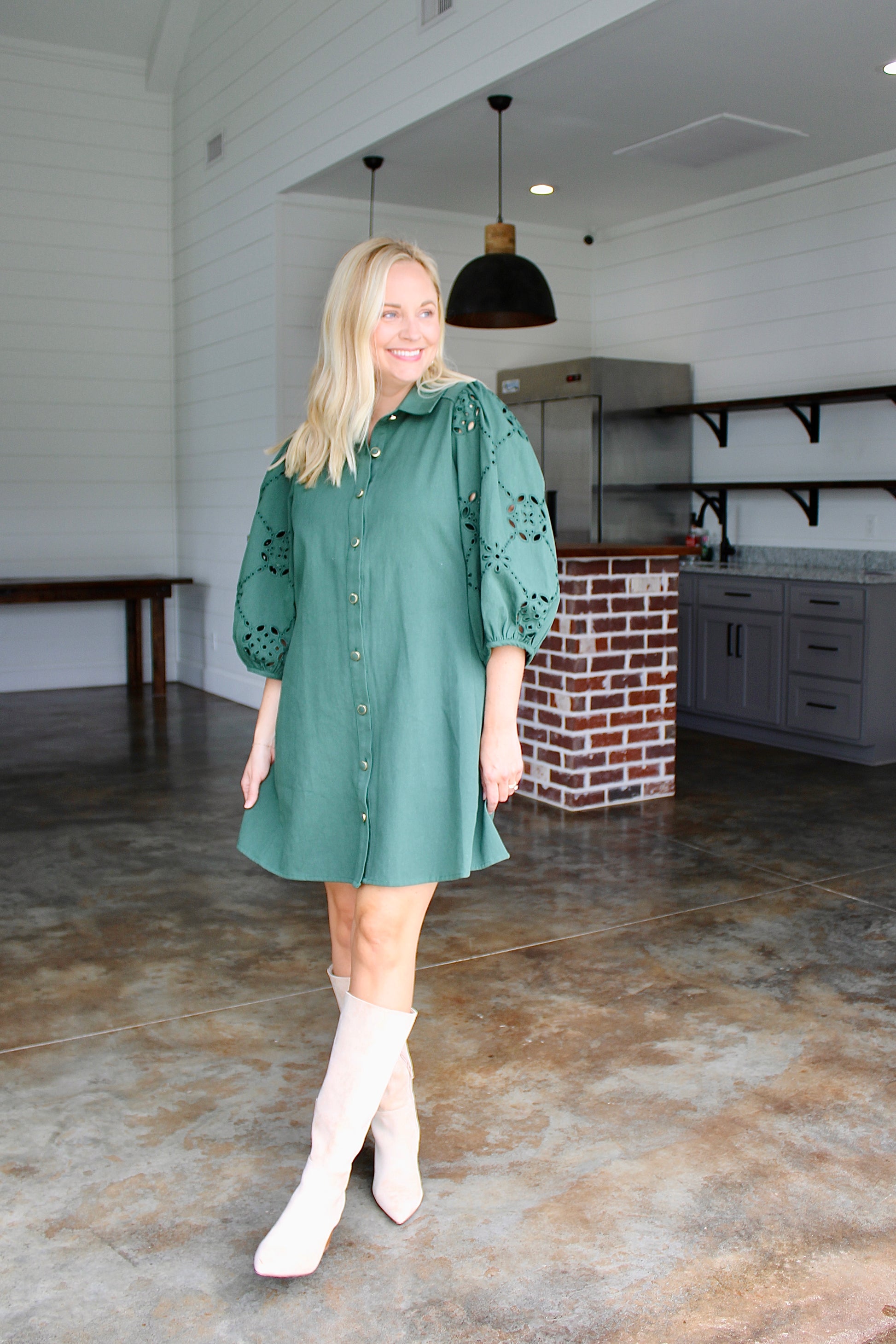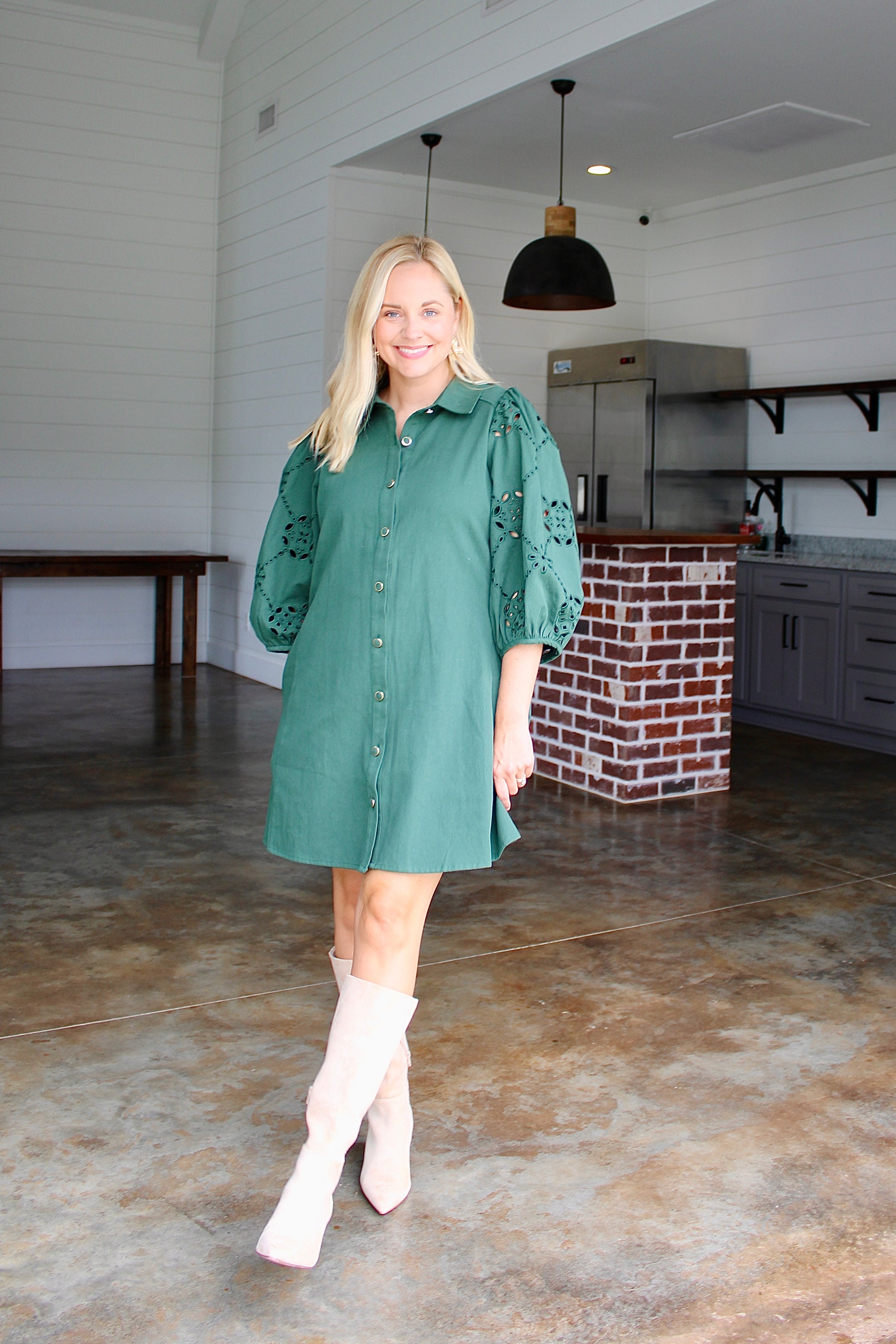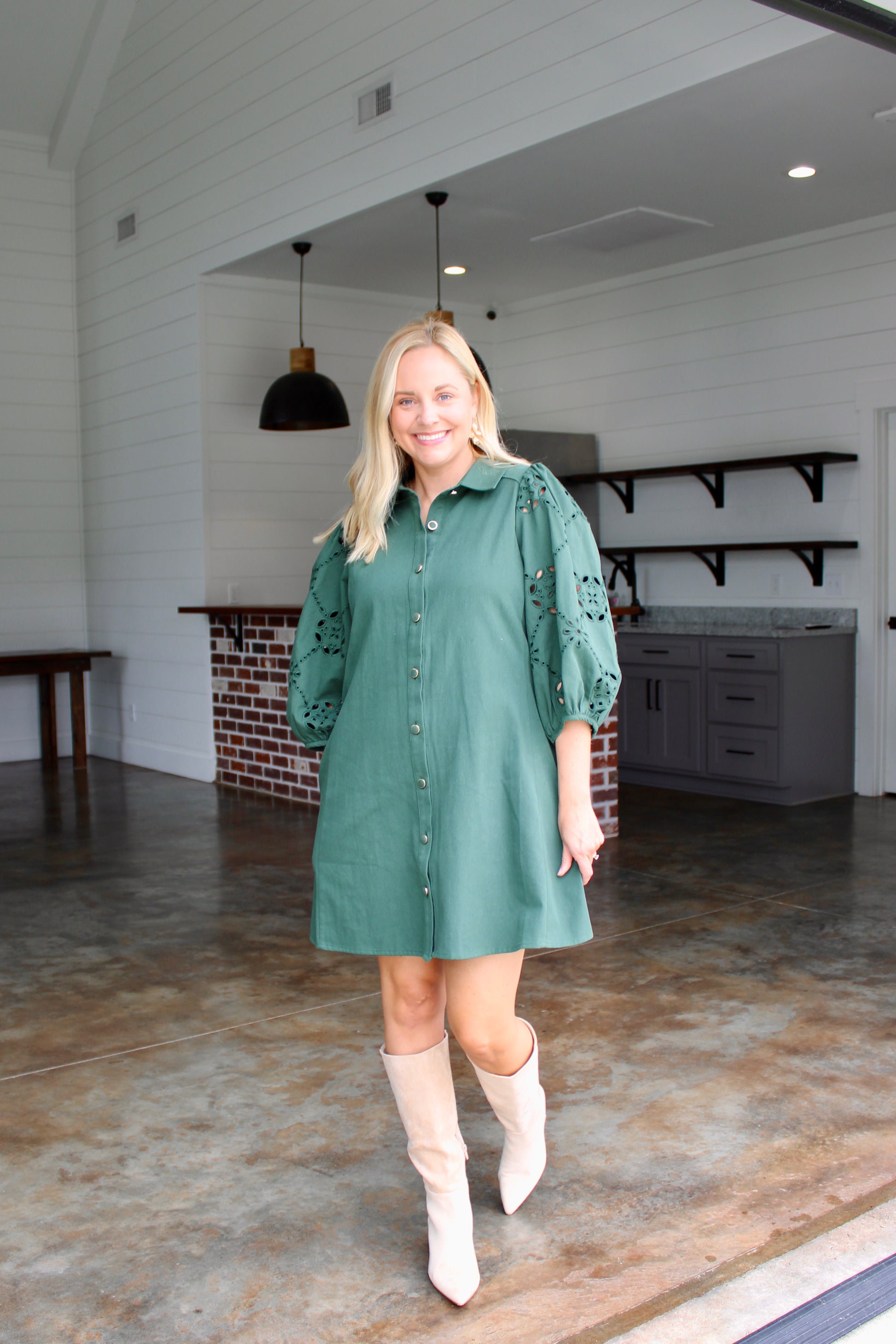 Solid eyelet ¾ puff sleeve mini dress featuring shirt collar and elasticated sleeve opening