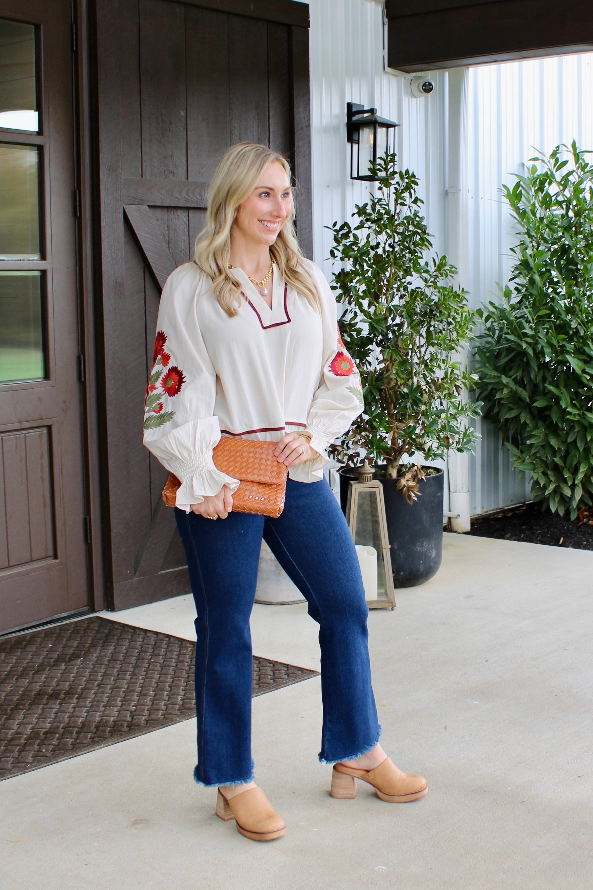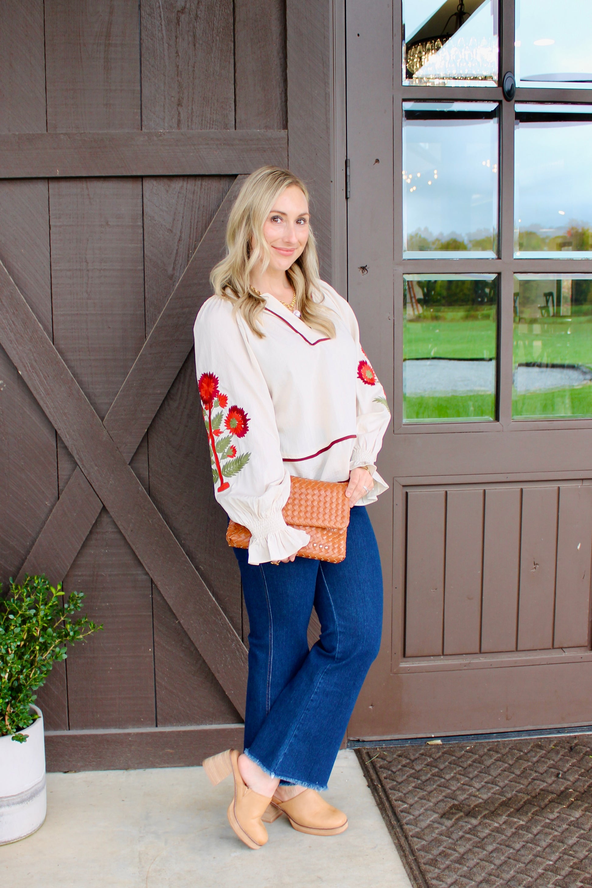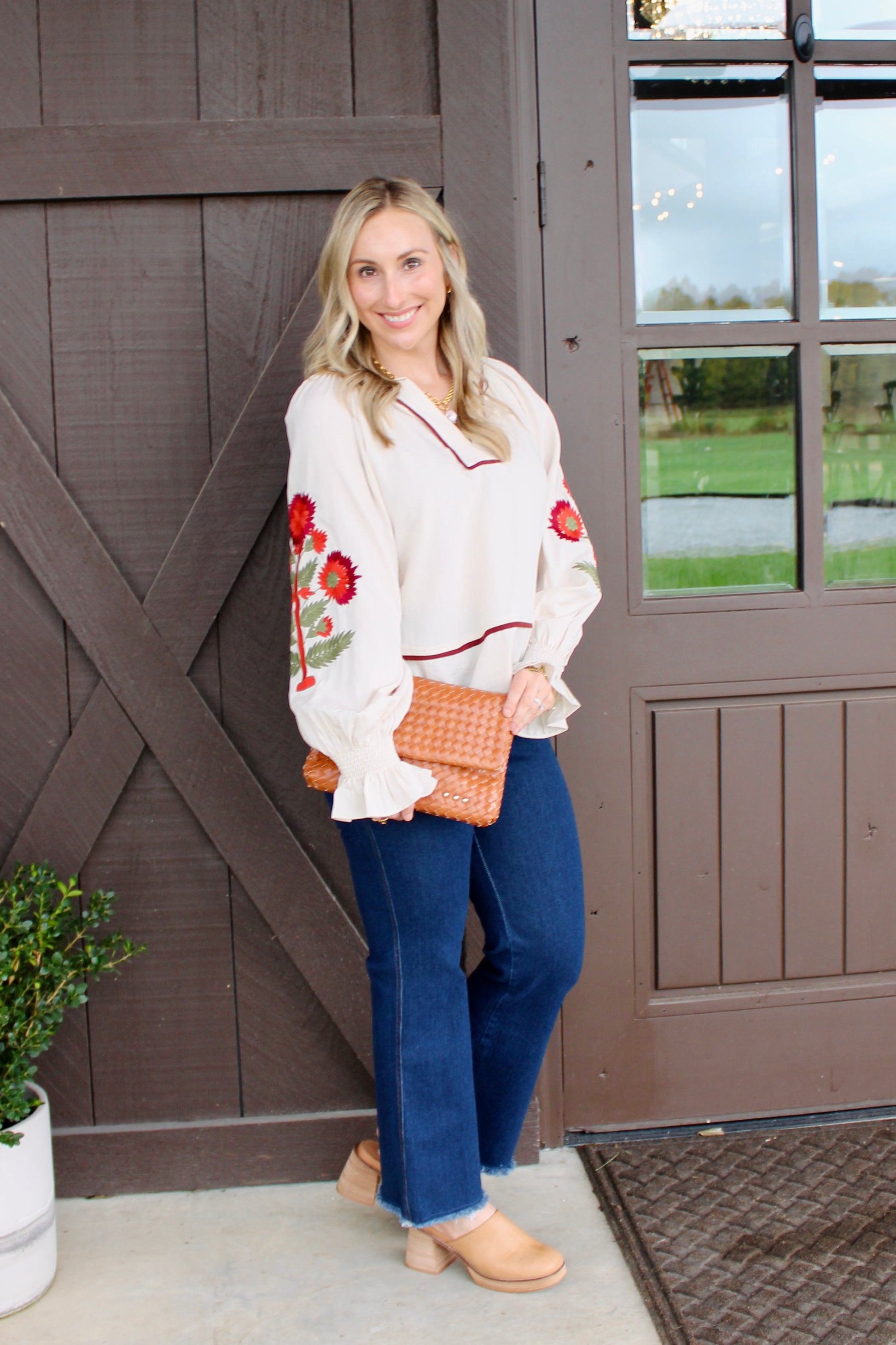 Solid long puff sleeve top featuring floral embroidery at sleeves. Contrast piping at neckline and waist. Smocked cuffs with ruffle edge