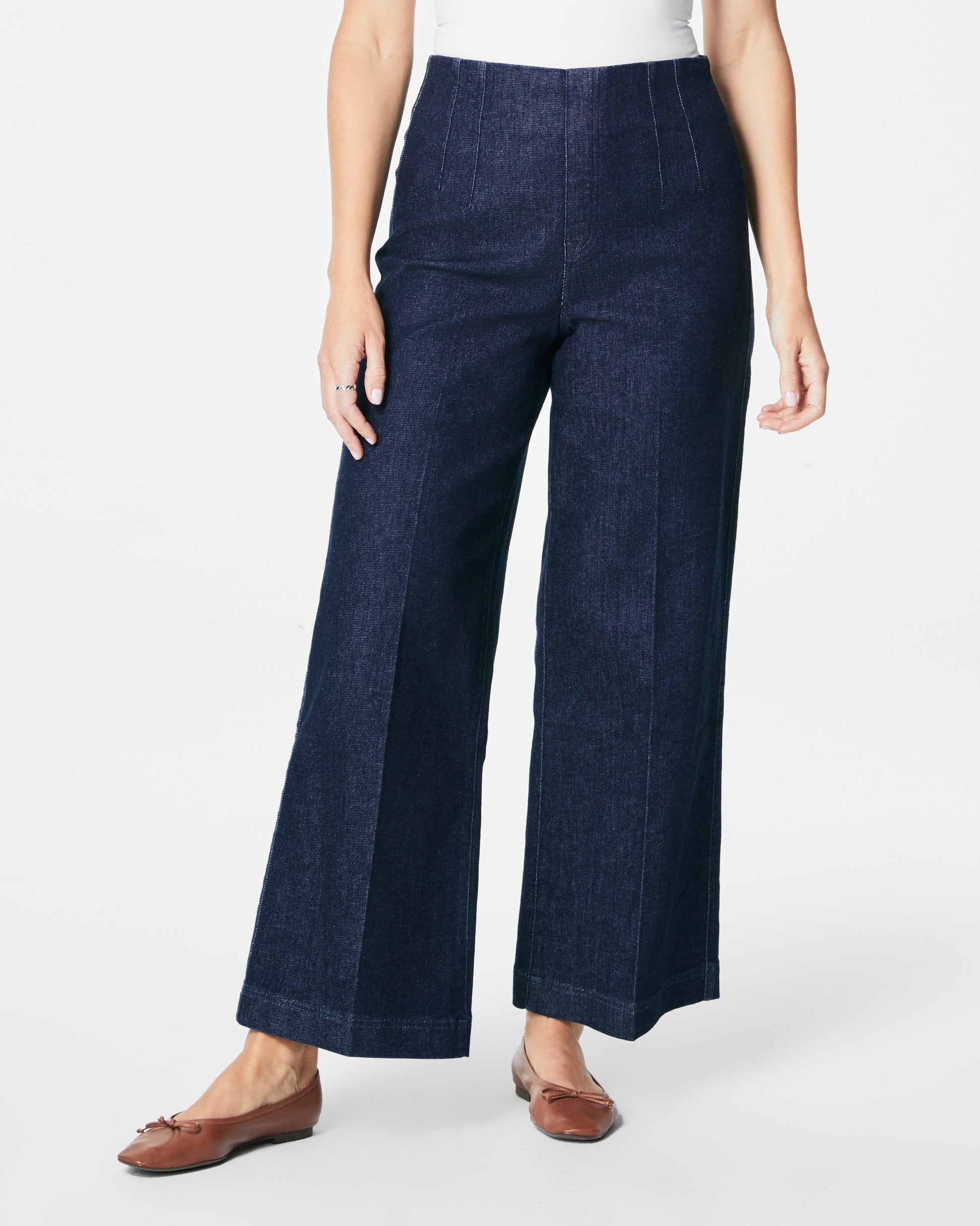 Crafted from premium, 4-way stretch denim designed to hug your curves, this jean is engineered with an invisible waistband and built-in targeted SPANX TummyTamer Tech™ that shapes your waist. Plus, with a cropped wide leg and high waist, these jeans elongate your leg and celebrate your figure. All you have to do is pull them on: no zippers, no buttons, no hip pockets (so no bulk!). This is denim done right.