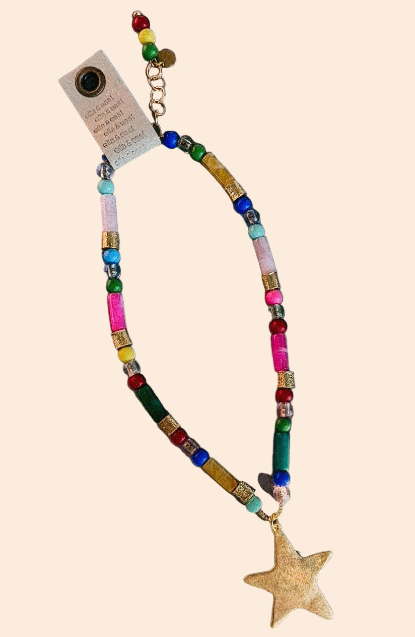 Colorful beaded necklace with a gold star charm. Perfect for layering or wearing solo