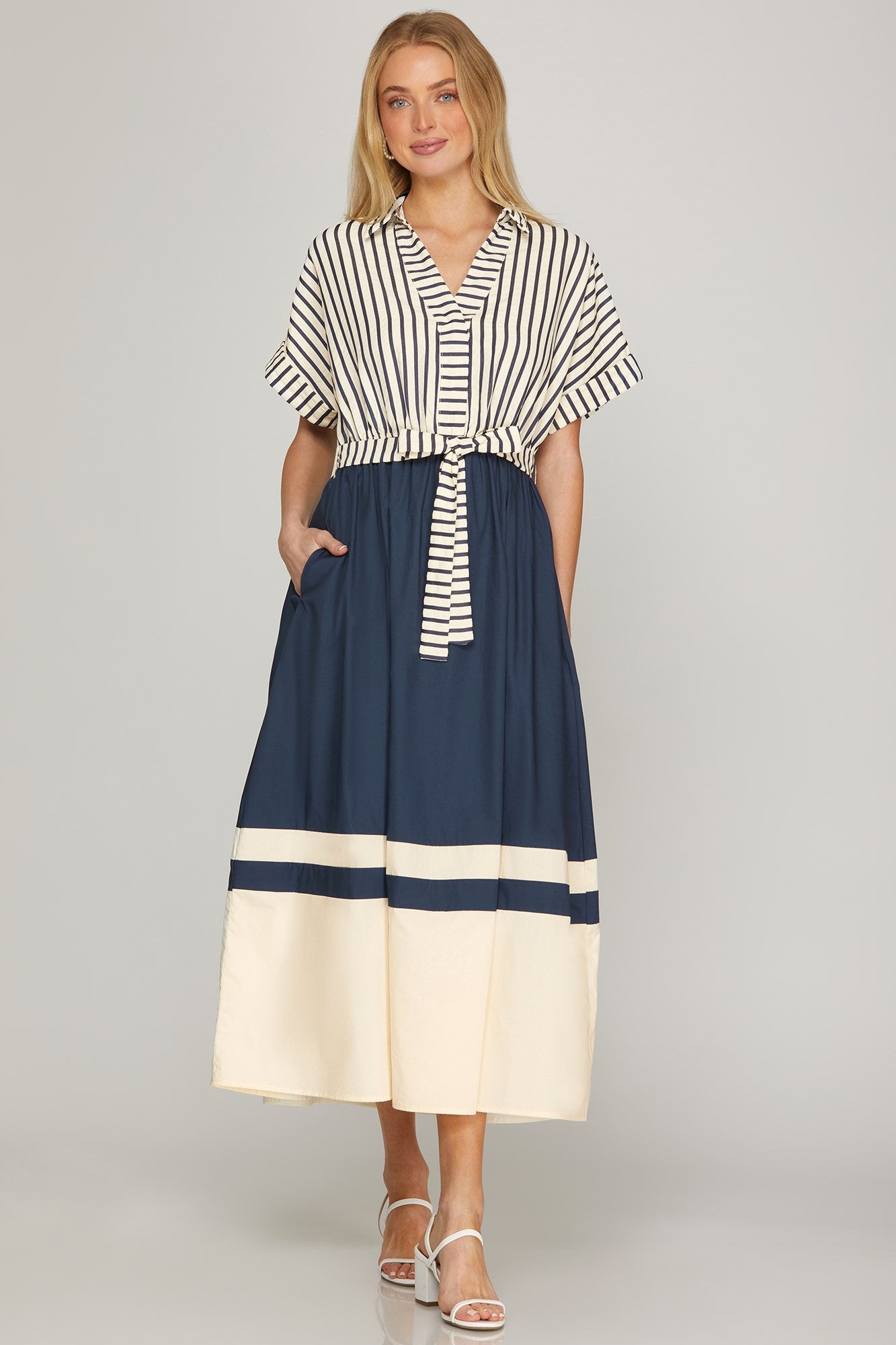 Short sleeve stripe color block midi dress with waist tie and pockets