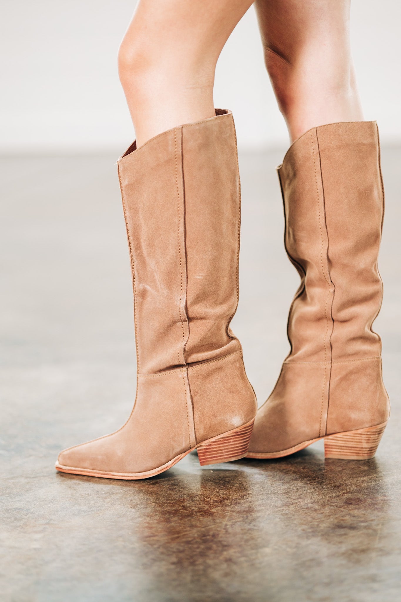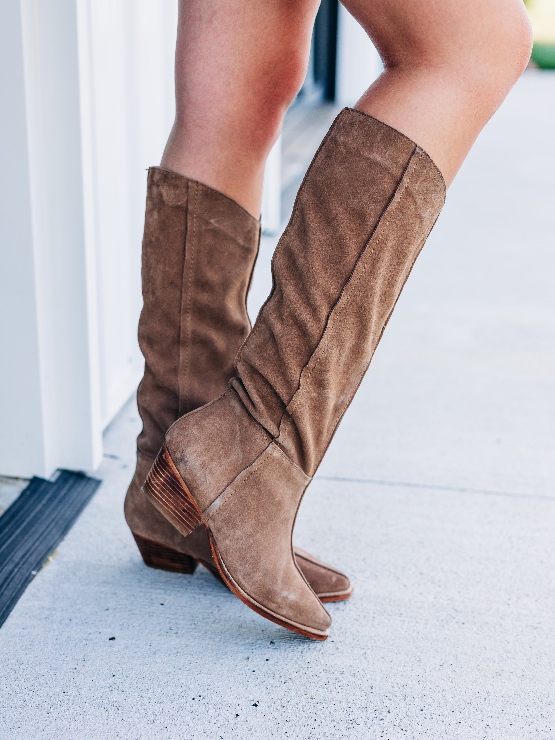 Step it up in these beautiful suede boots featured in a slouchy style with a pointed toe and stacked heel.