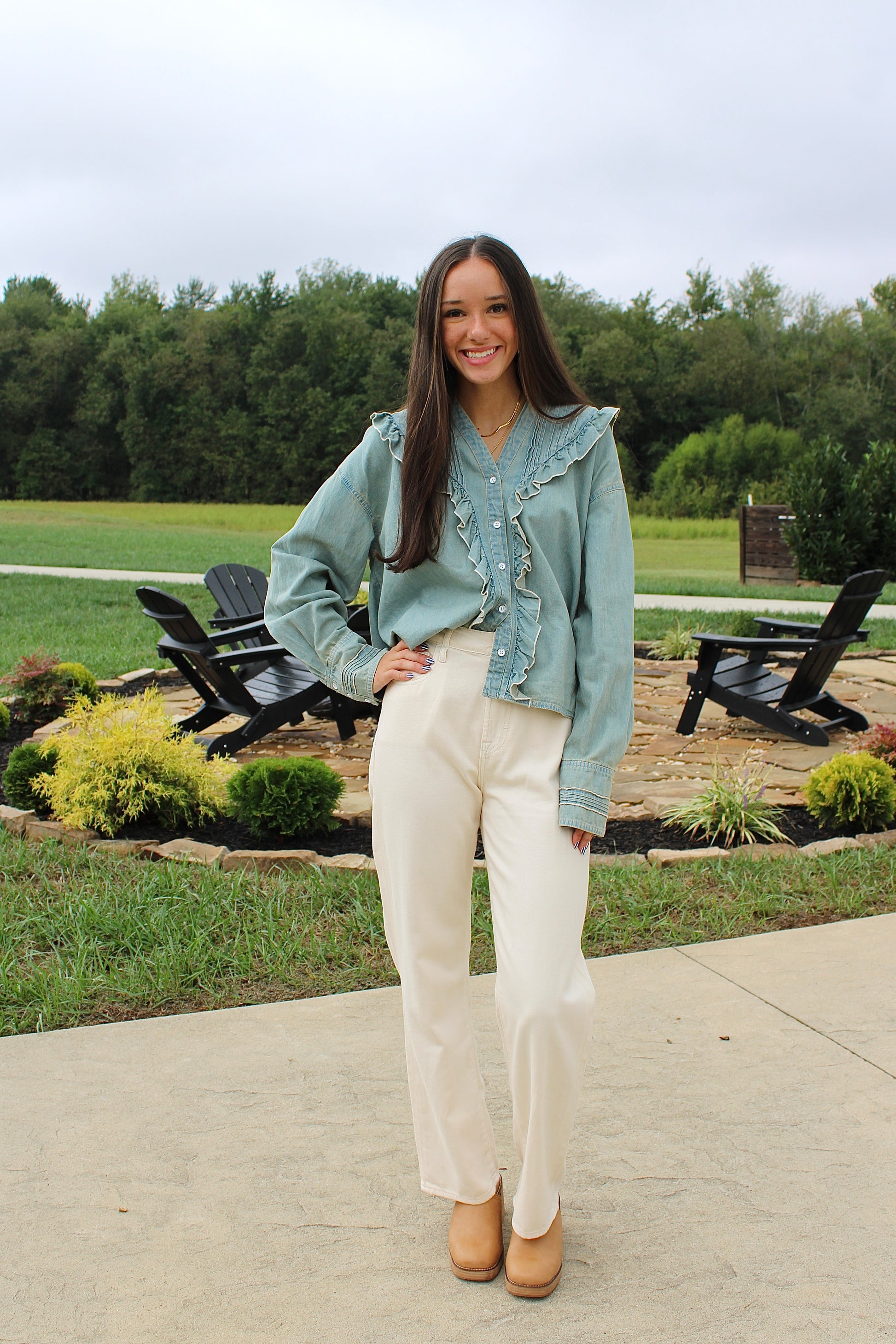 Ruffled details give this oversized chambray button-down from We The Free the perfect dose of femme flair.