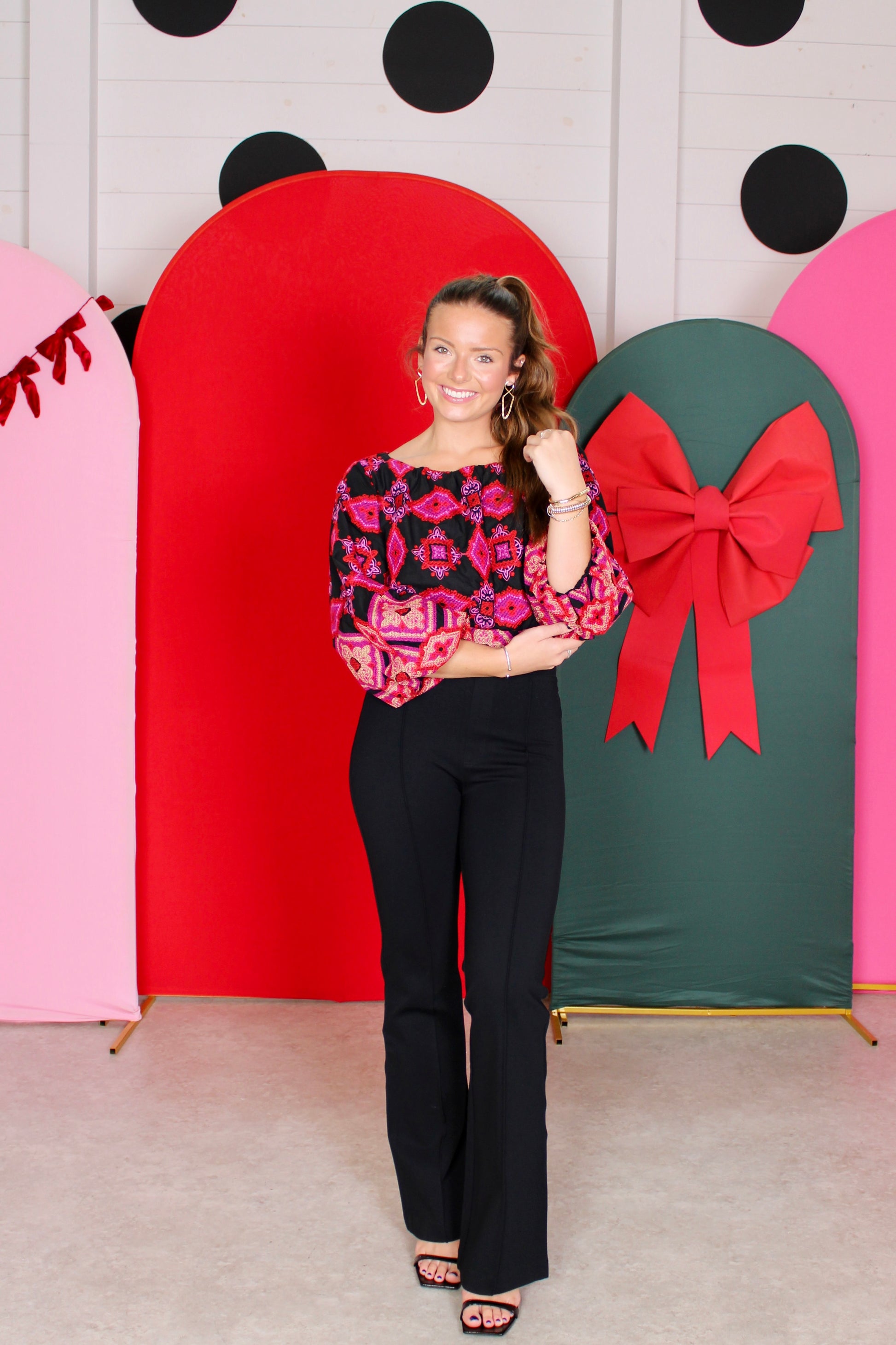 This crop top features a embroidered print with a stylish round neckline for a bold, playful look.