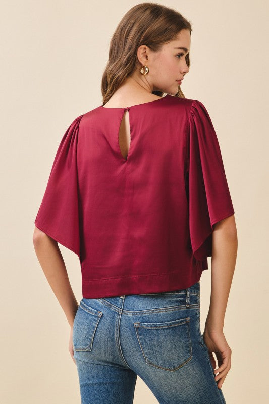 A satin top featuring a round neckline and short flutter sleeves. Designed with a relaxed, boxy fit and a back keyhole closure. Finished with a slightly cropped hem.