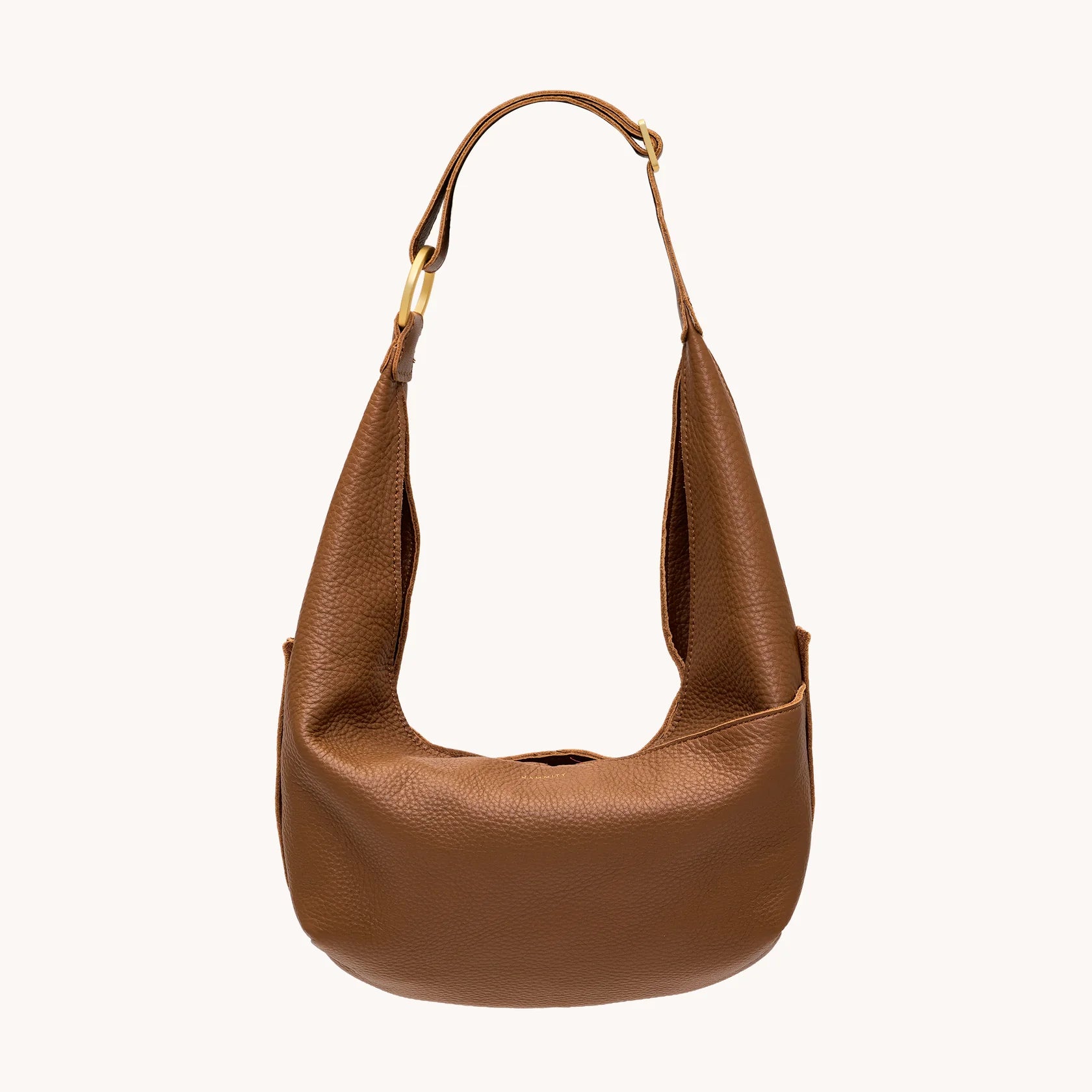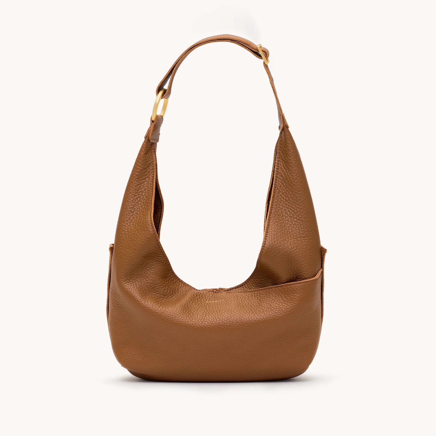 - Crafted with a soft pebbled leather with a hint of shine featuring a warm medium brown hue