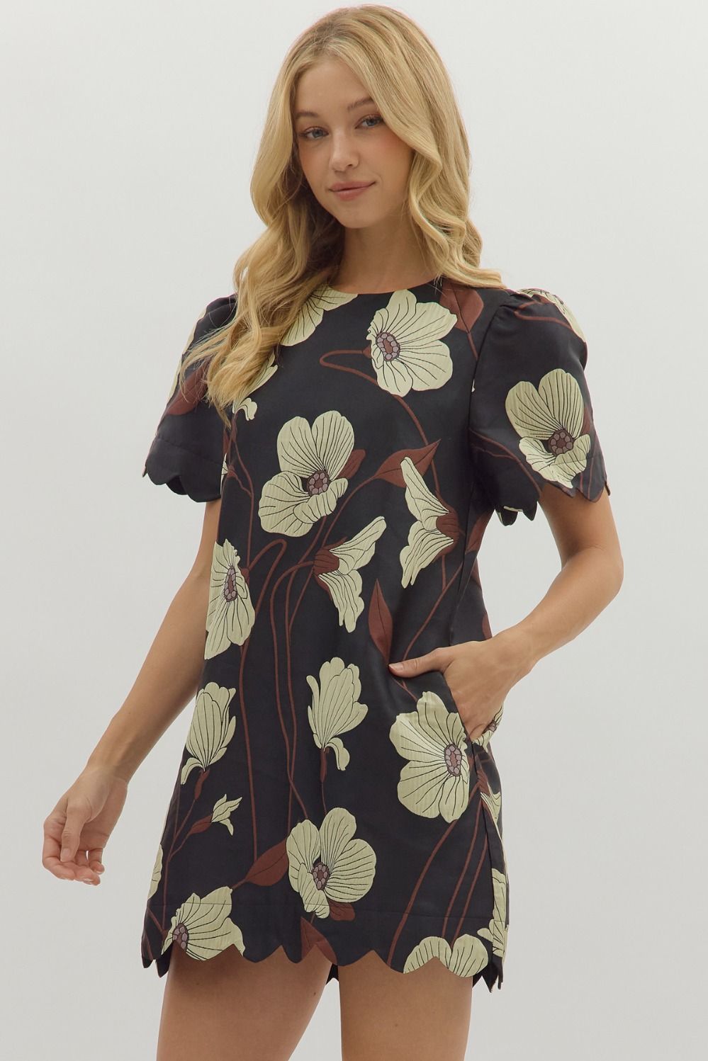 Floral jacquard short sleeve mini dress featuring scallop hem finish. Zipper closure at back
