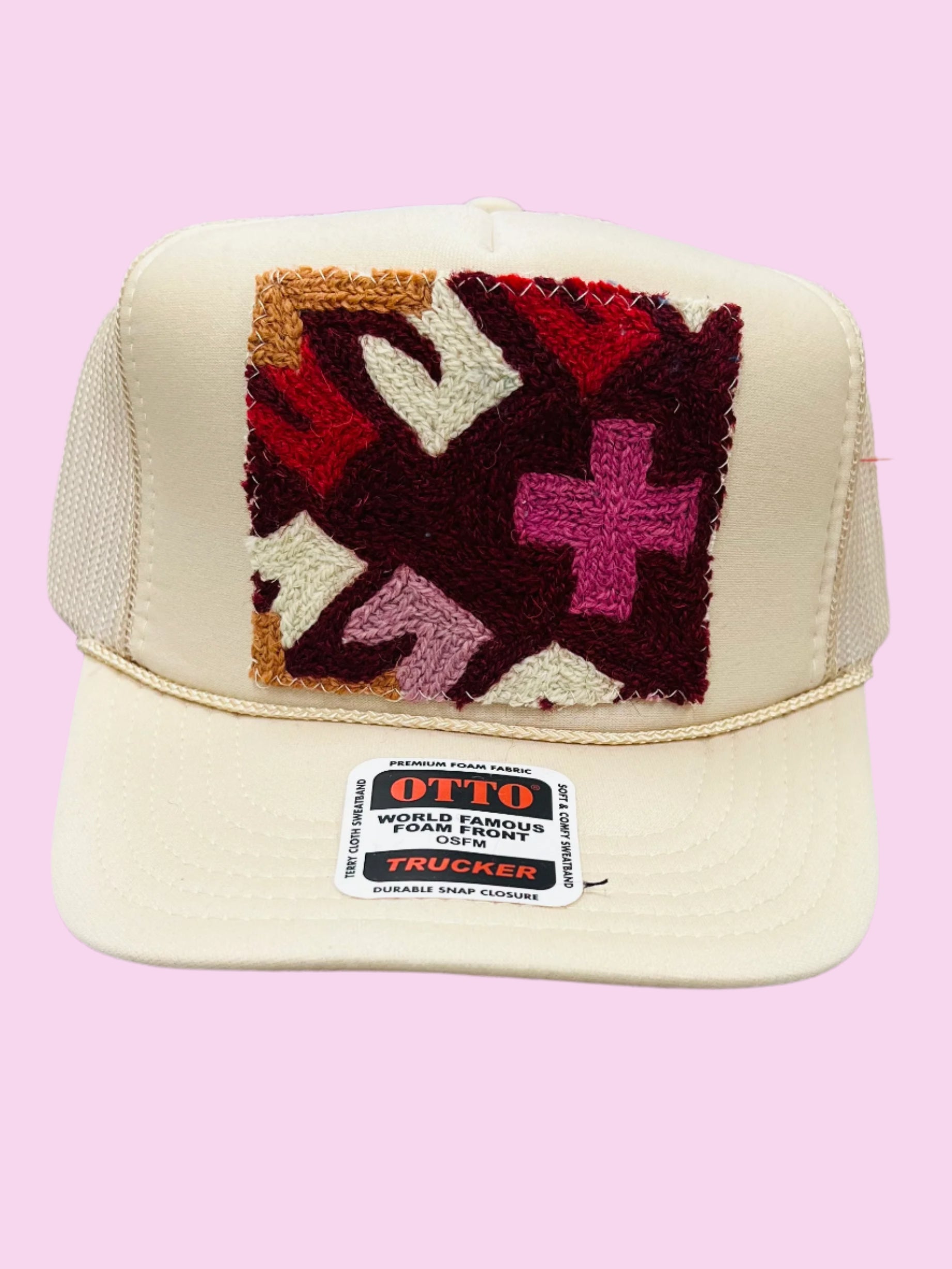 Your easy, throw-on-and-go, trucker hat with Turkish kilim patch. No two are alike! Truckers are one size hat with high crown, structured bill and mesh back with adjustable snaps.