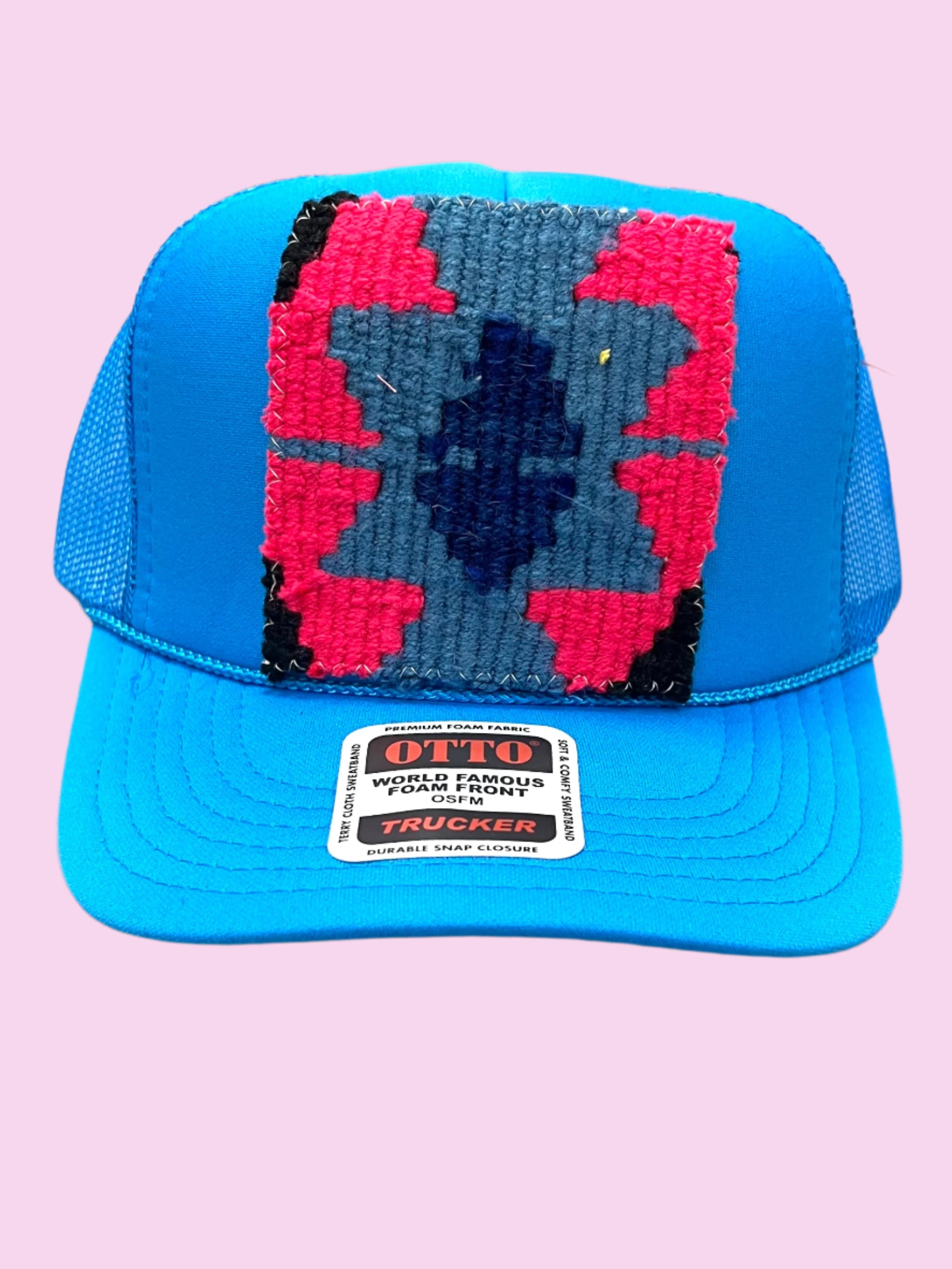Your easy, throw-on-and-go, trucker hat with Turkish kilim patch. No two are alike! Truckers are one size hat with high crown, structured bill and mesh back with adjustable snaps.