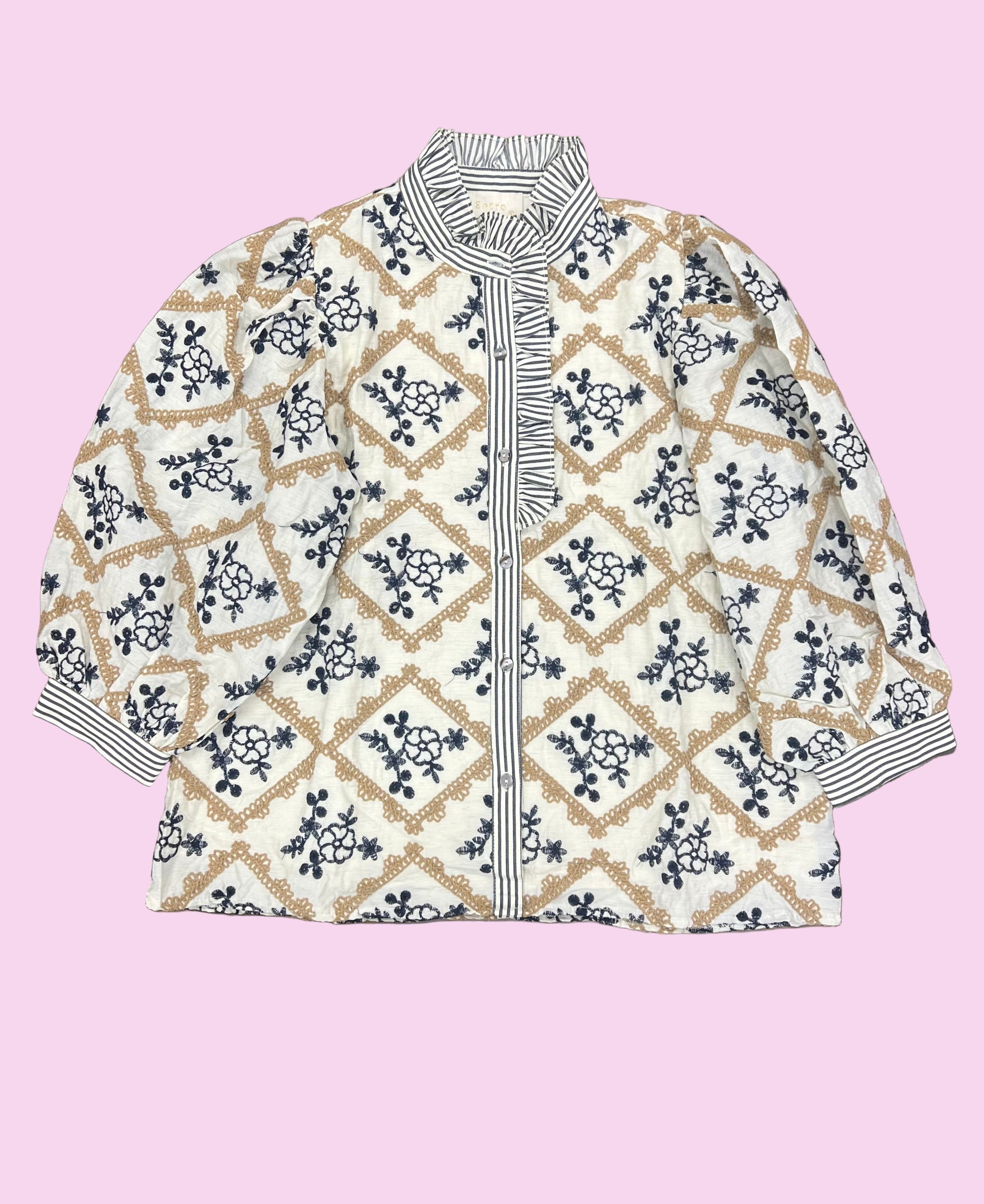 Abstract pattern embroidered 3/4 puff sleeve top.